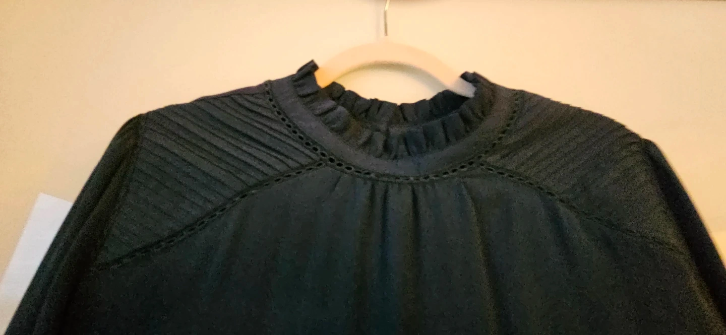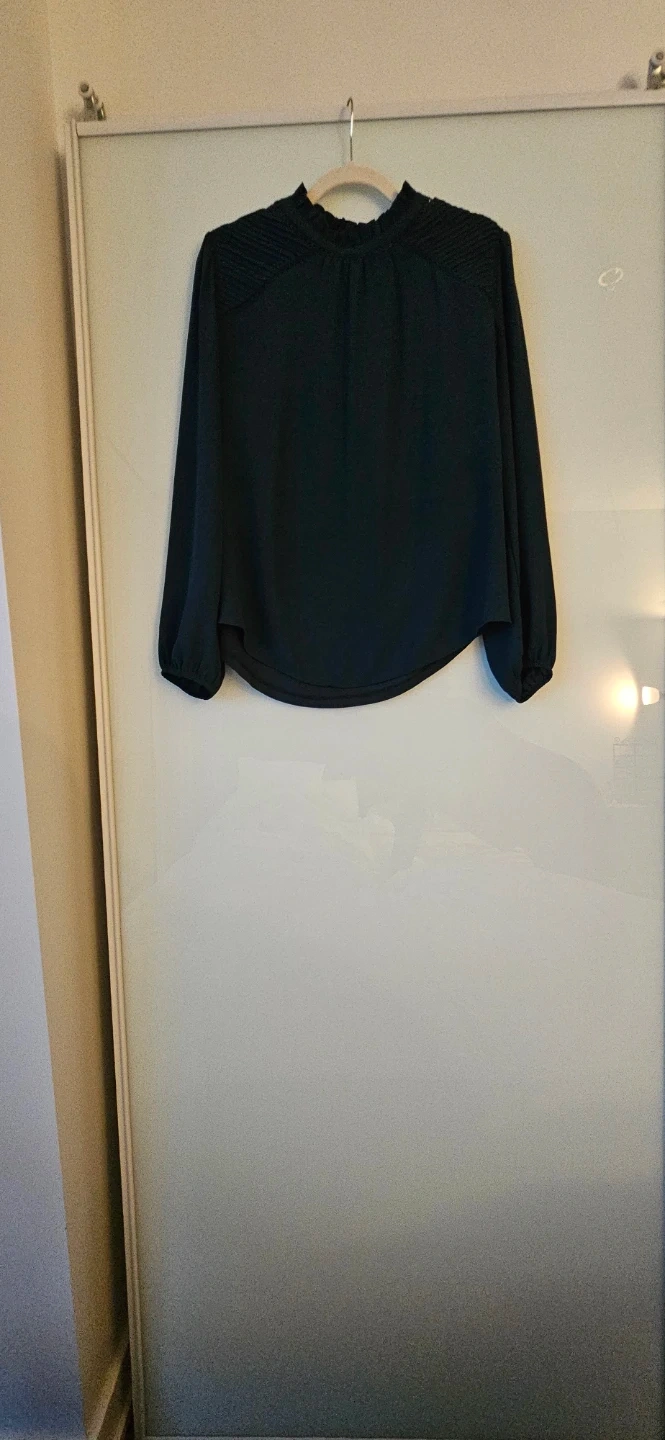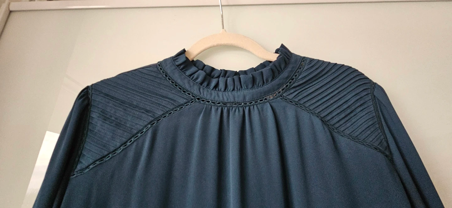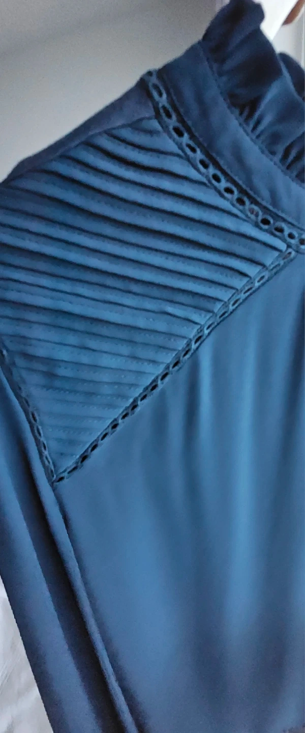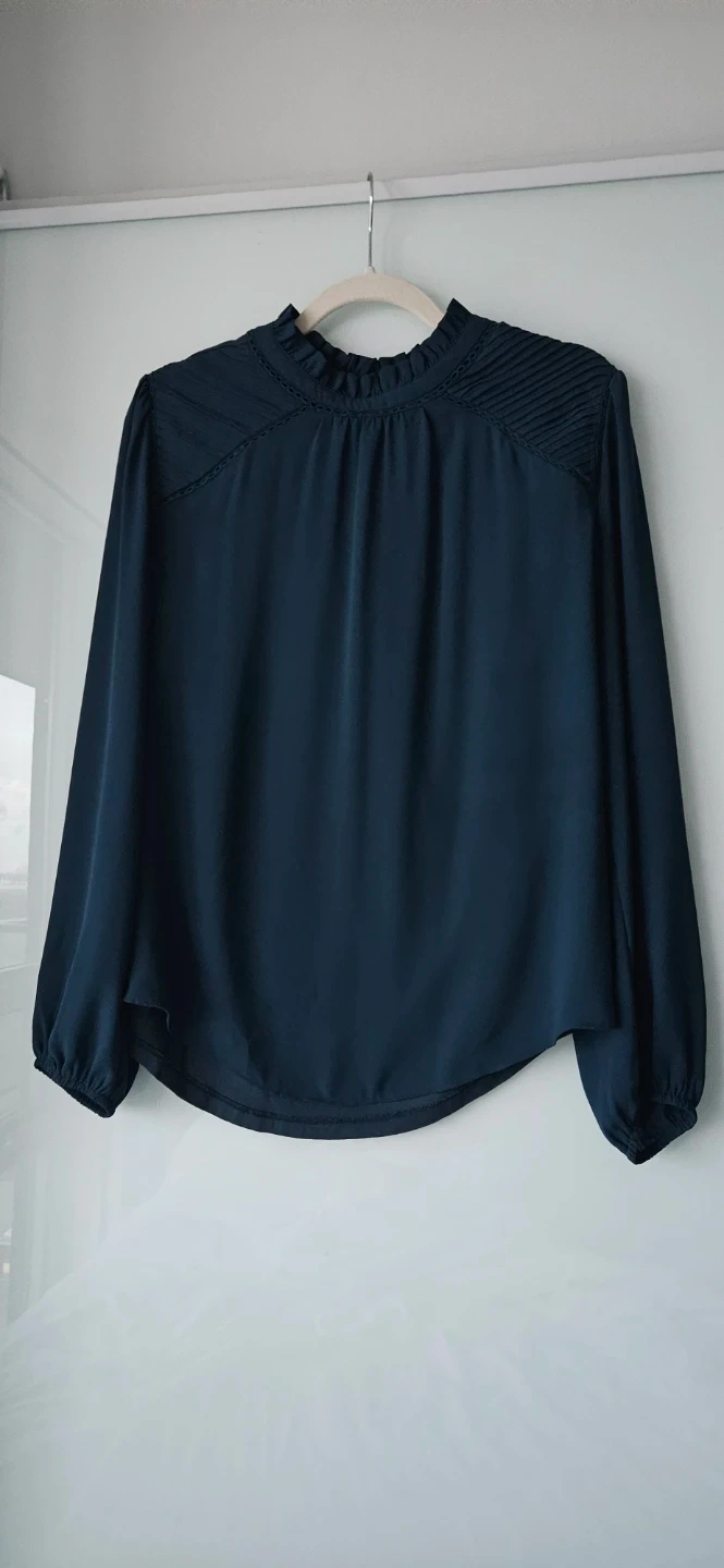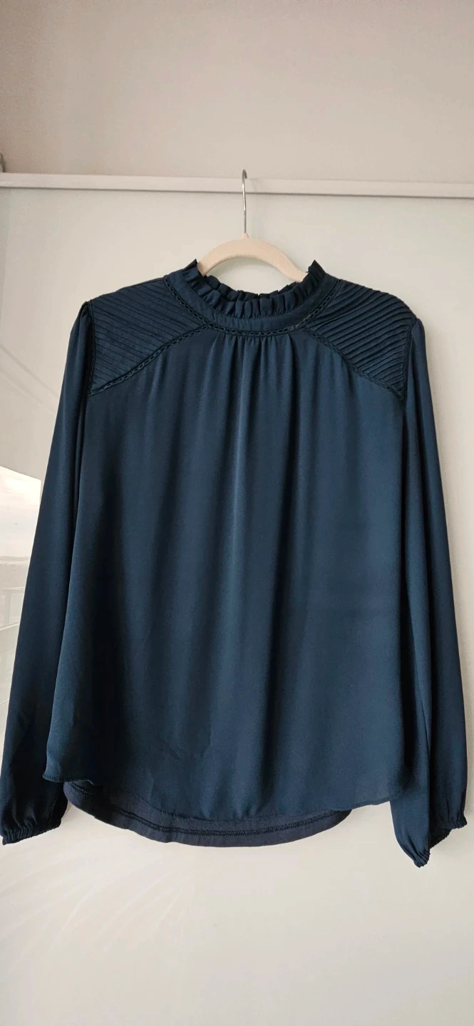 This LOFT blouse is a beautiful dark teal colour. It features a mock neck with subtle pleating detail at the shoulders and neckline. Size Medium.