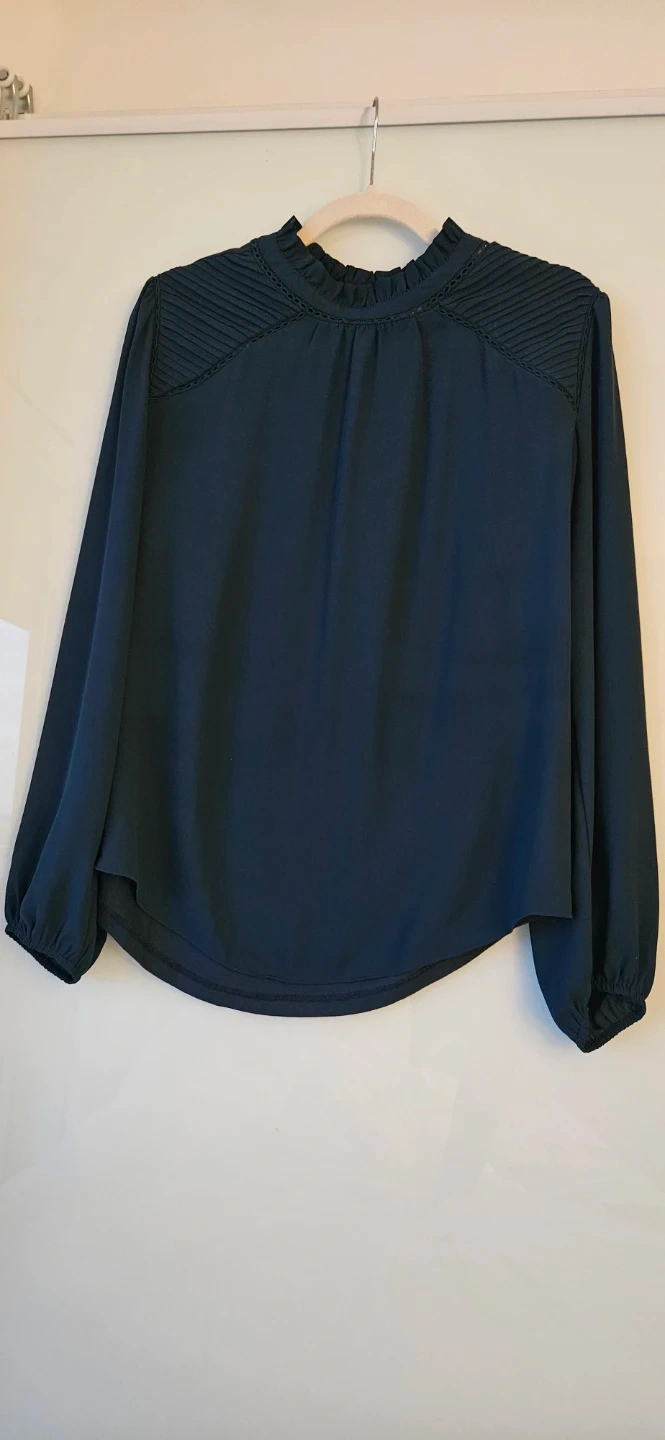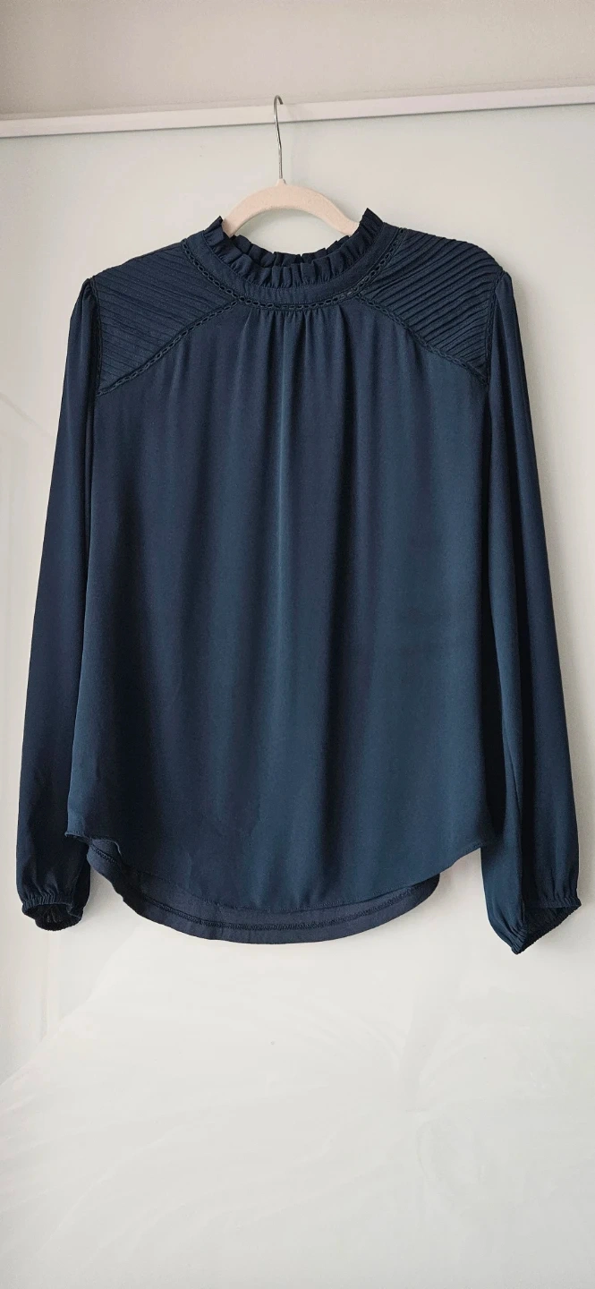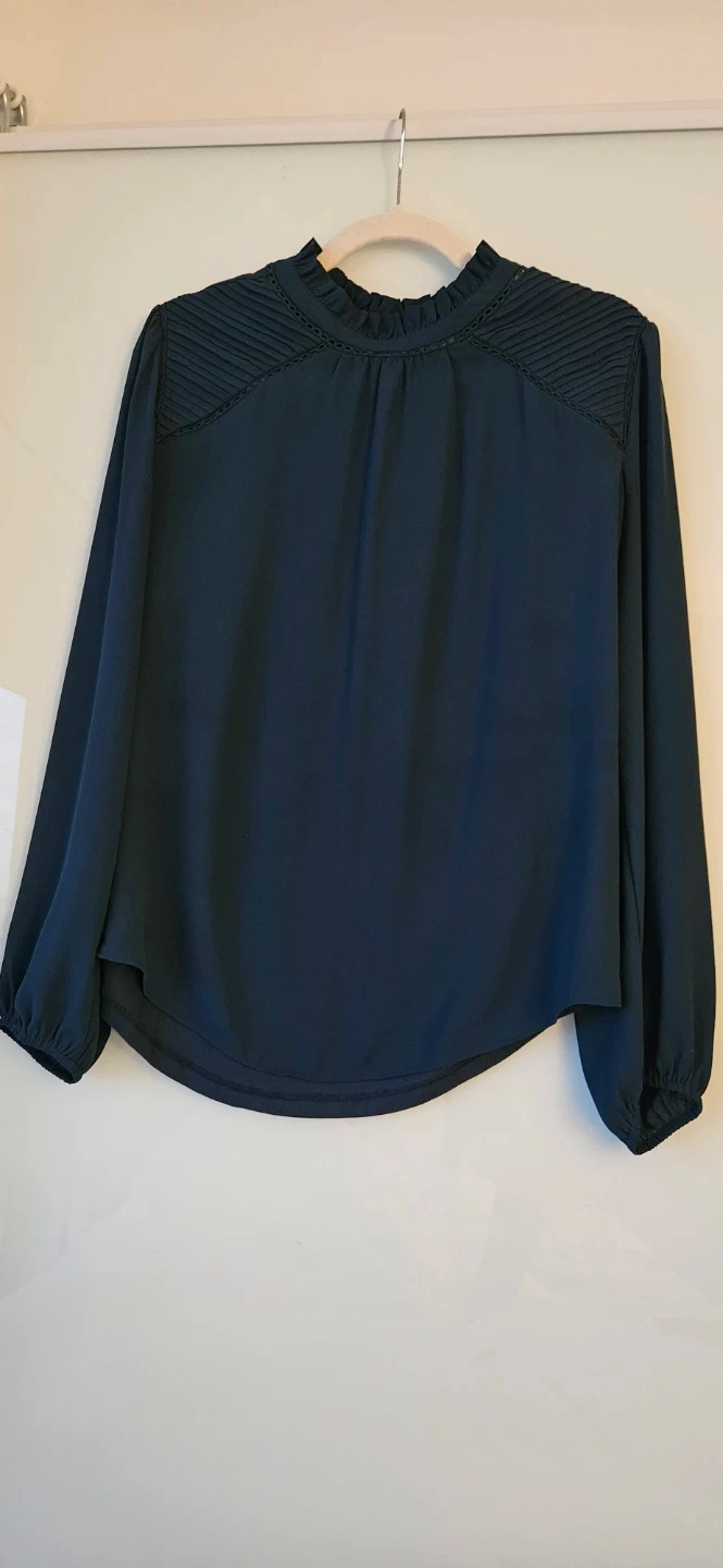 This LOFT blouse is a beautiful dark teal colour. It features a mock neck with subtle pleating detail at the shoulders and neckline. Size Medium.