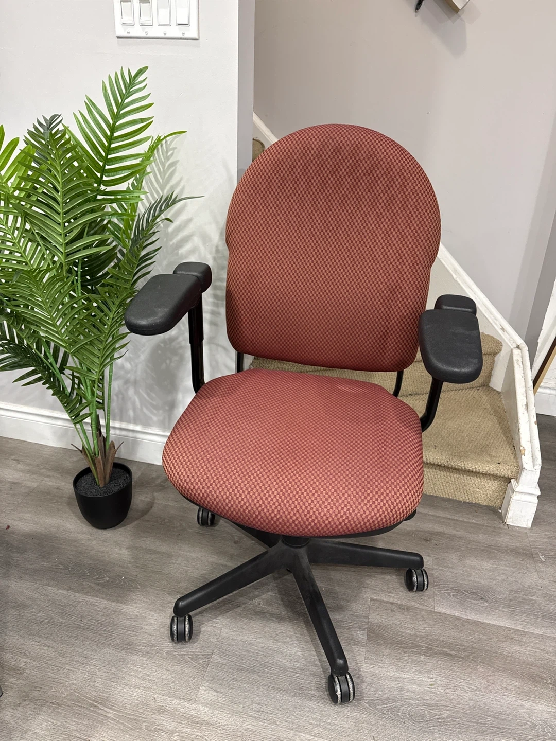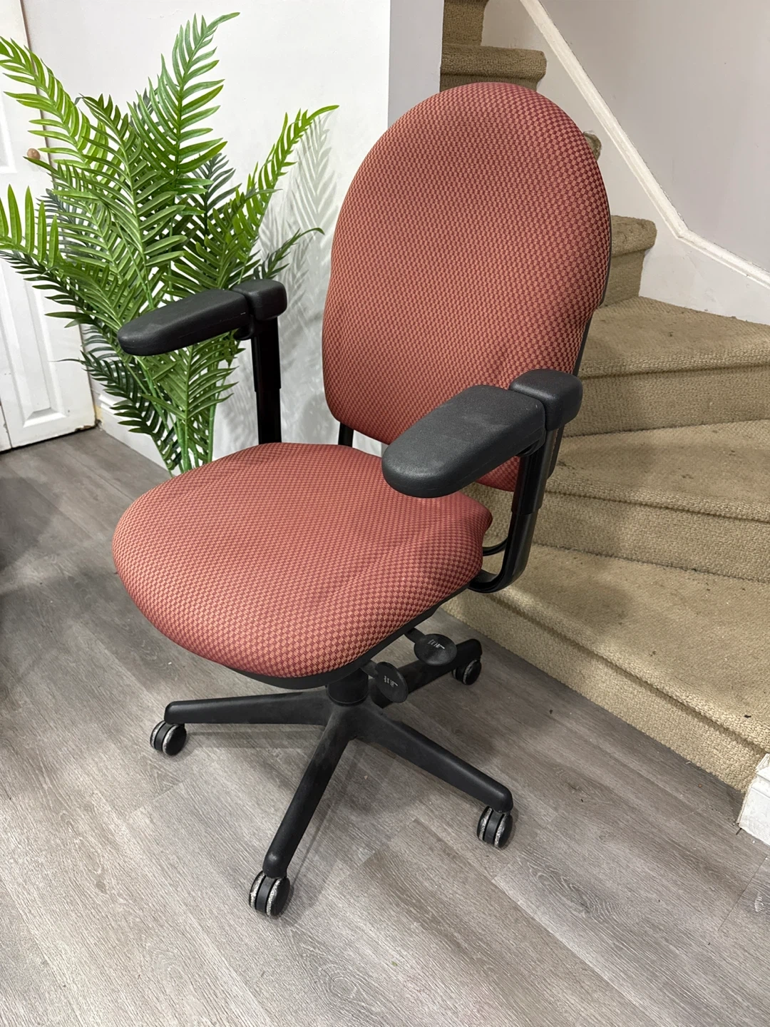 Chair: Terracotta patterned fabric, adjustable armrests and height, smooth-rolling swivel base. In great condition.