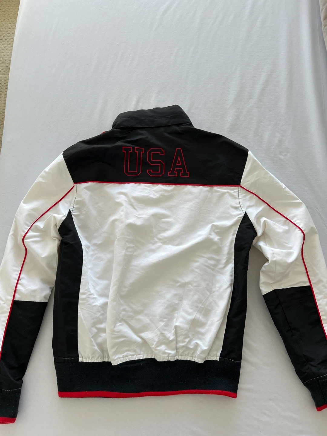 Track jacket with a 'USA' design on the back. Features a full zip front and contrasting colour panels. It's made from a lightweight material.