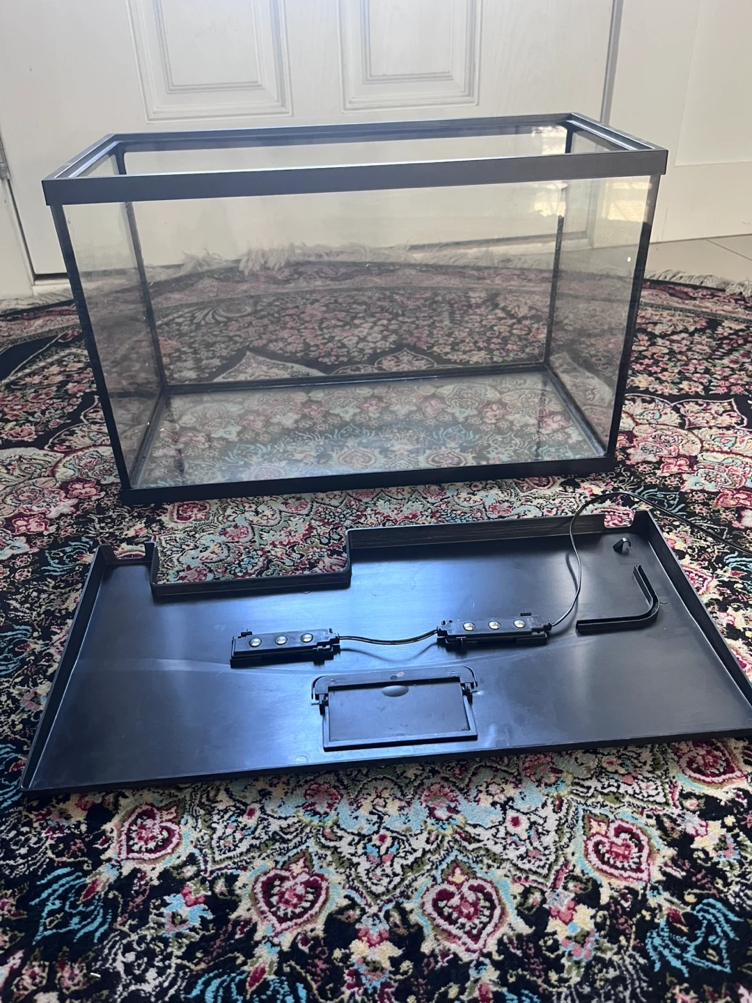 This is a complete aquarium kit, perfect for setting up a new fish tank. It includes a glass tank, filter, heater, water conditioner, bacteria supplement, and a variety of fun decorations like an octopus, unicorn, and shark. It also comes with a small net and thermometer. The kit provides everything needed to get started with a freshwater or saltwater aquarium!