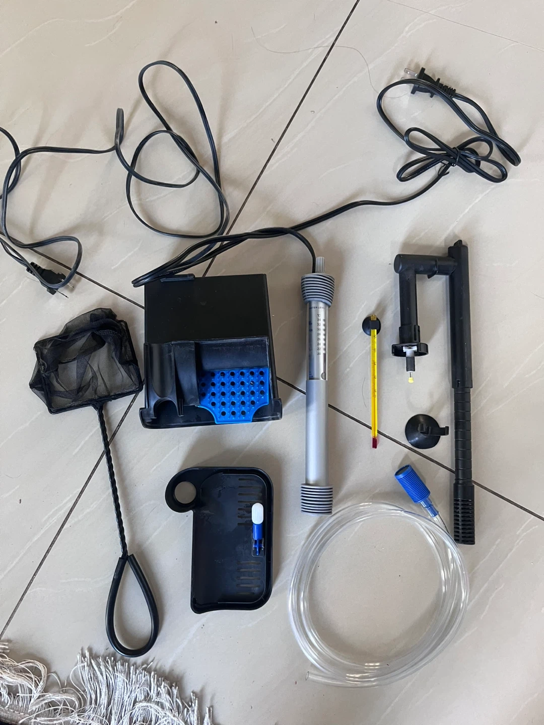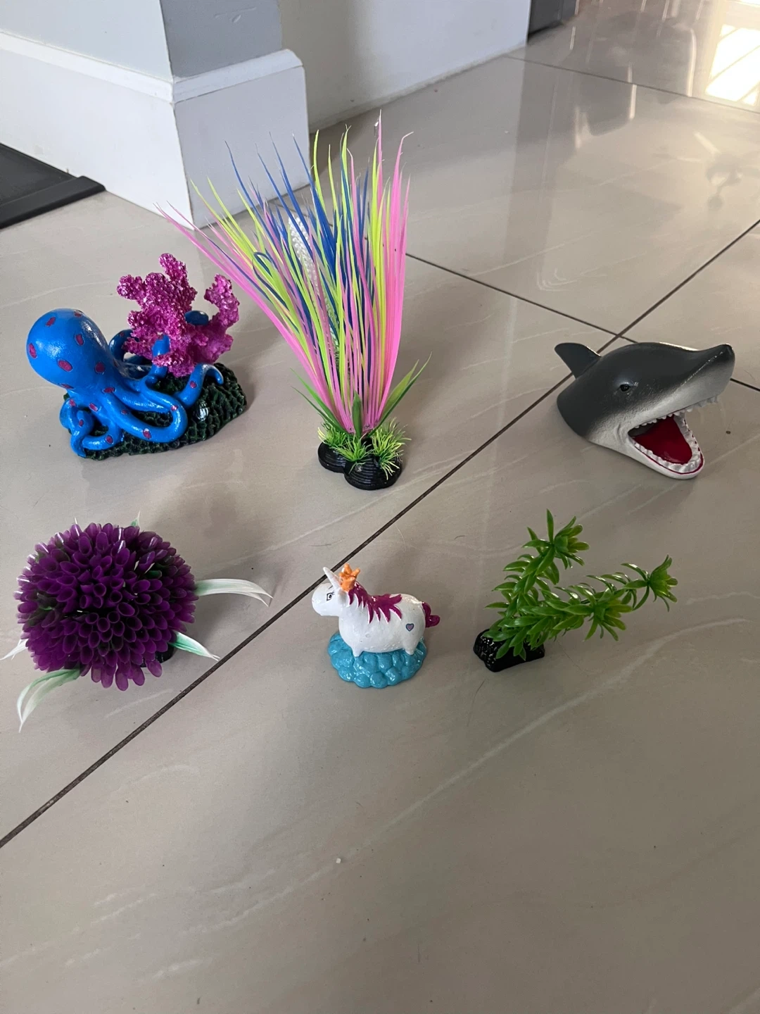 This is a complete aquarium kit, perfect for setting up a new fish tank. It includes a glass tank, filter, heater, water conditioner, bacteria supplement, and a variety of fun decorations like an octopus, unicorn, and shark. It also comes with a small net and thermometer. The kit provides everything needed to get started with a freshwater or saltwater aquarium!