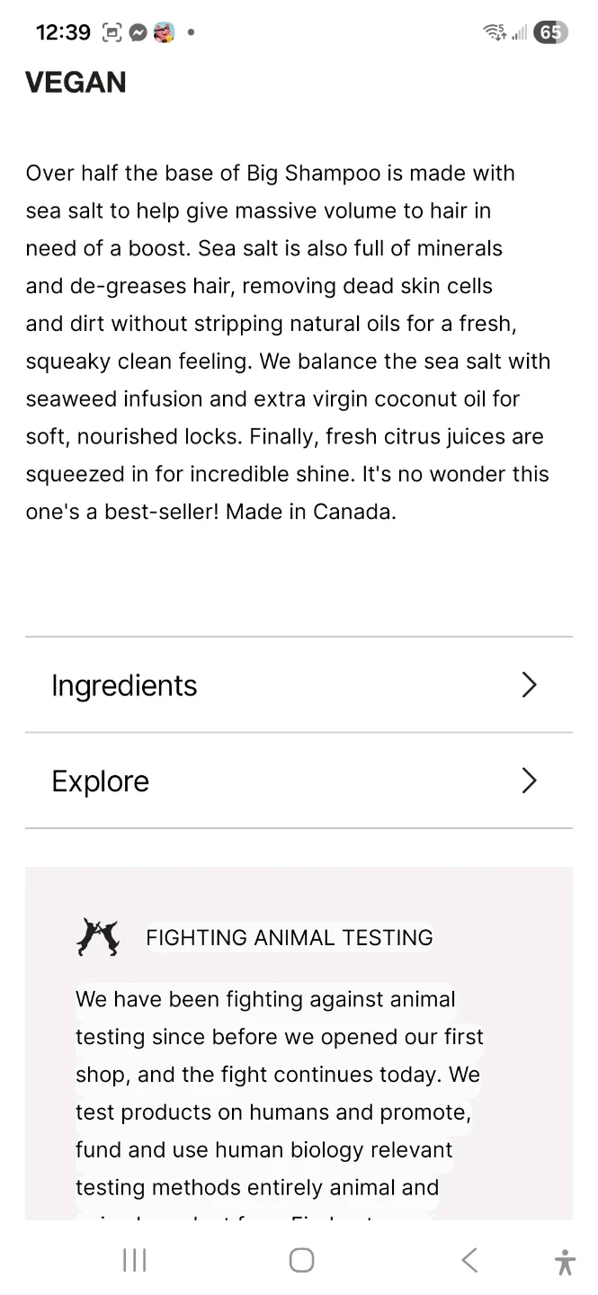 This BIG Shampoo by Lush has a sea salt base to help give massive volume to hair. Sea salt is also full of minerals and de-greases hair. It's balanced with seaweed infusion and extra virgin coconut oil. Fresh citrus juices add incredible shine. Made in Canada.