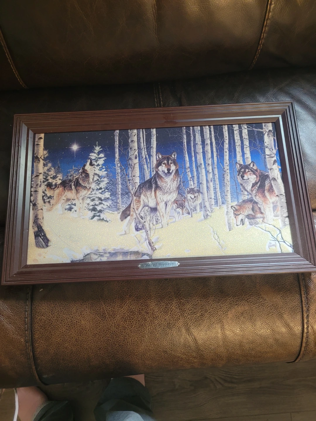 Beautiful framed art print featuring a pack of wolves in a snowy forest scene. The artwork is titled "Star of Wonder" and has a subtle glitter effect. It's ready to hang on your wall! With battery eyes of wolves glow