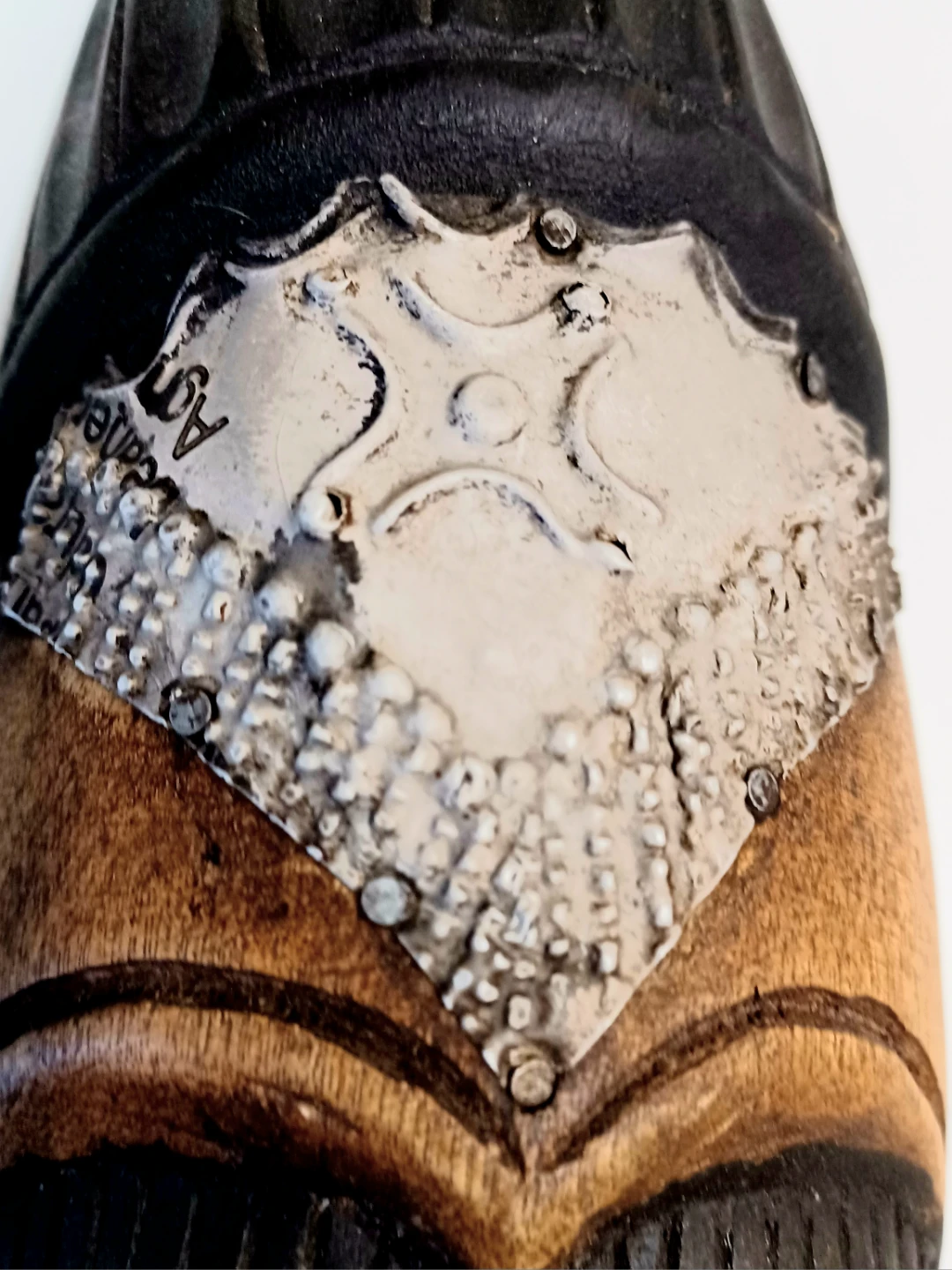 Unique, One of a Kind, Vintage Striking piece of Hand Crafted Art, Hand-hammered Stamped Silver Forehead and Hand Hammered Brass Cheeks , Tall Hand Crafted Wooden Table/Mantel Decor Mask