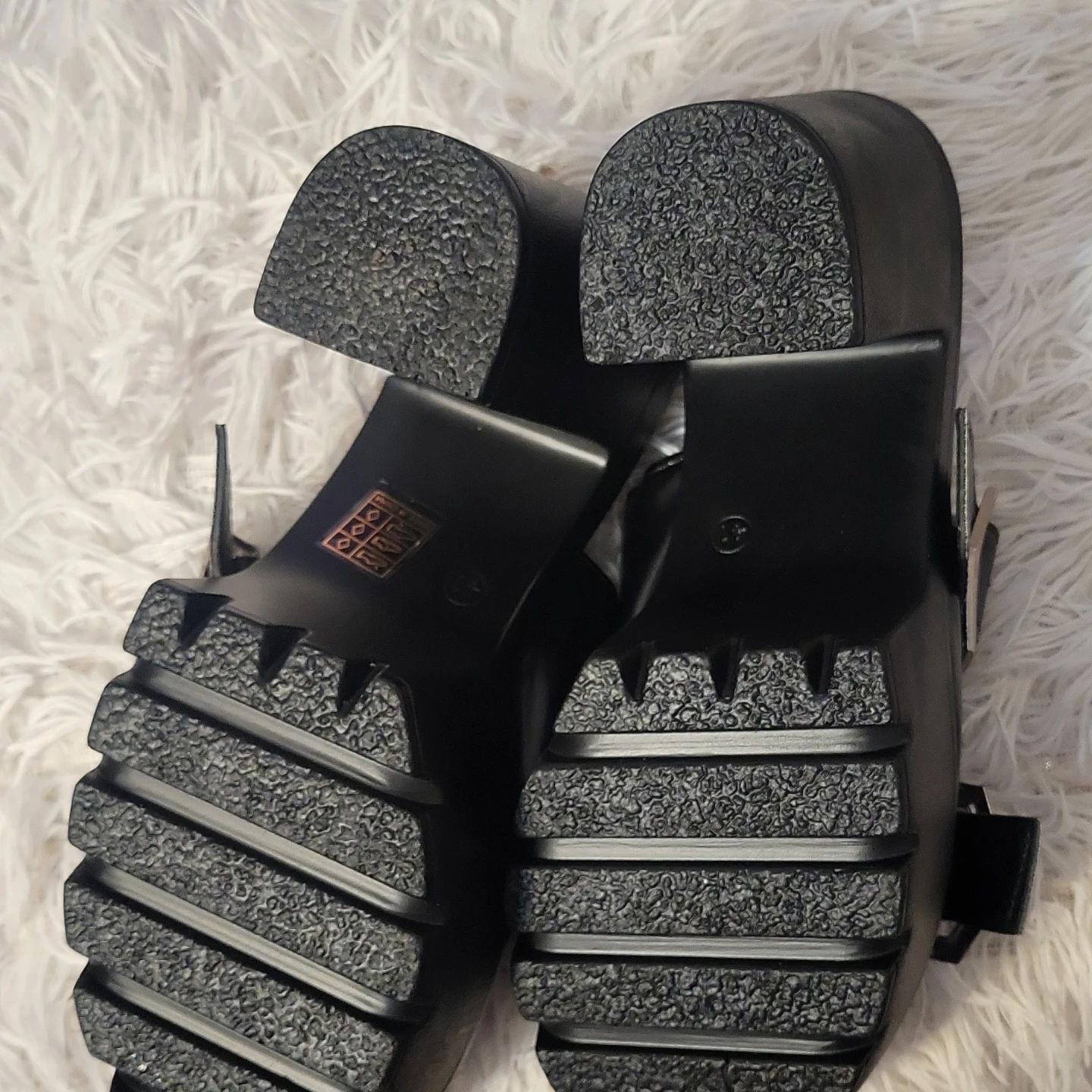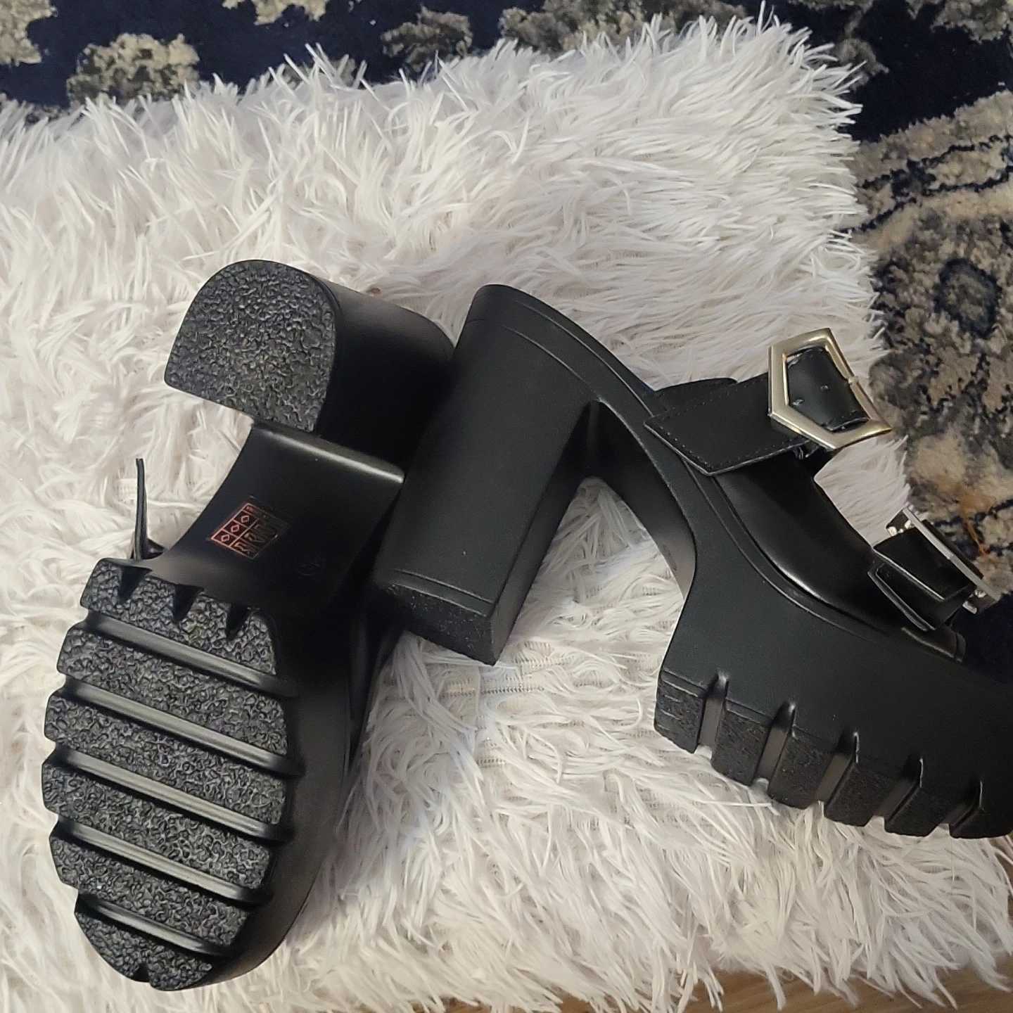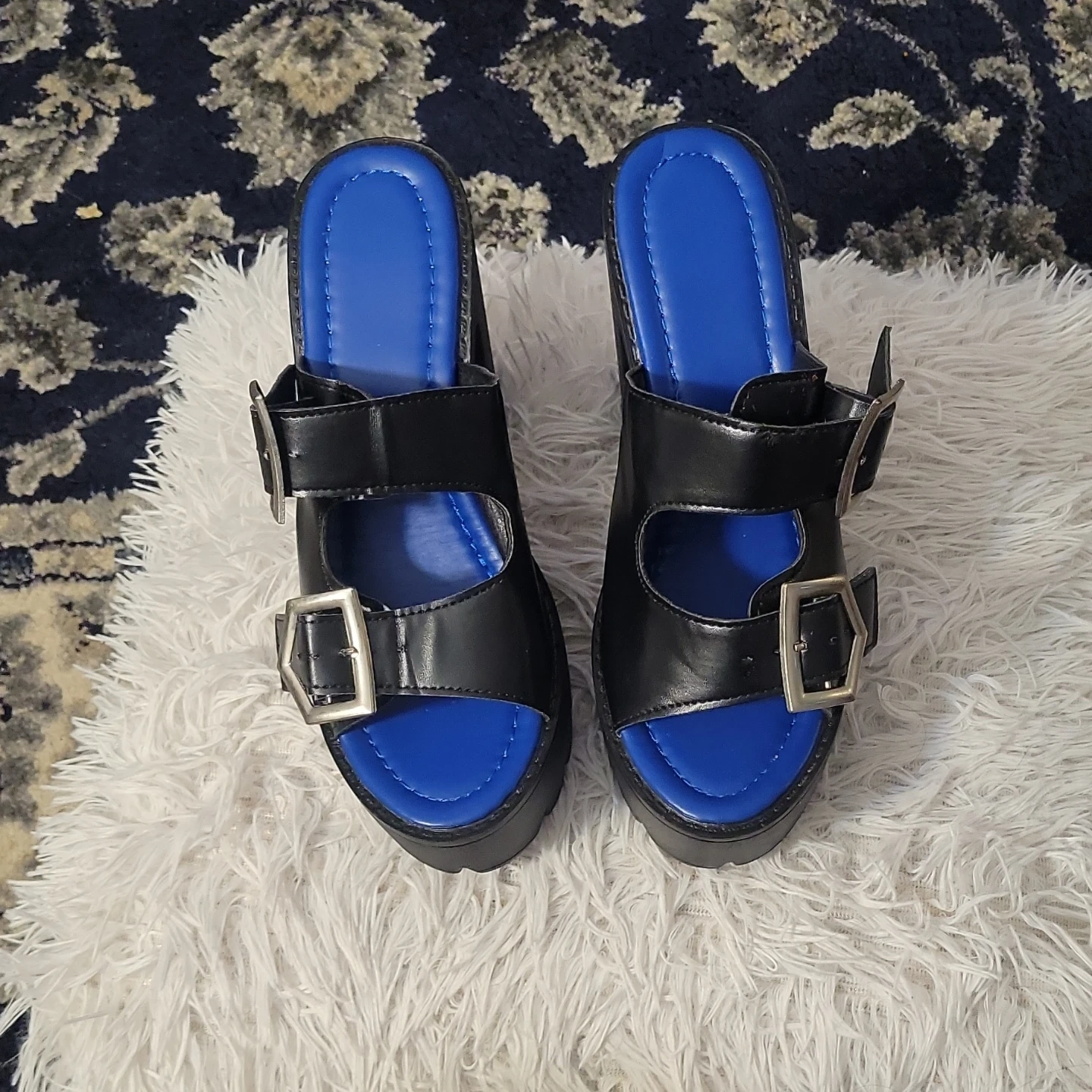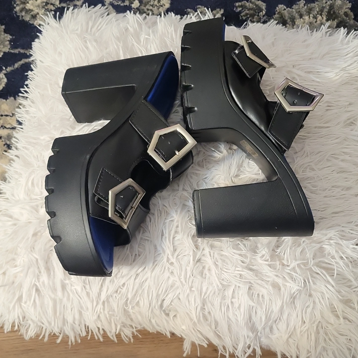 Chunky black platform sandals with a bright blue insole and silver buckle details. These offer a bold, edgy style and a comfortable platform height.