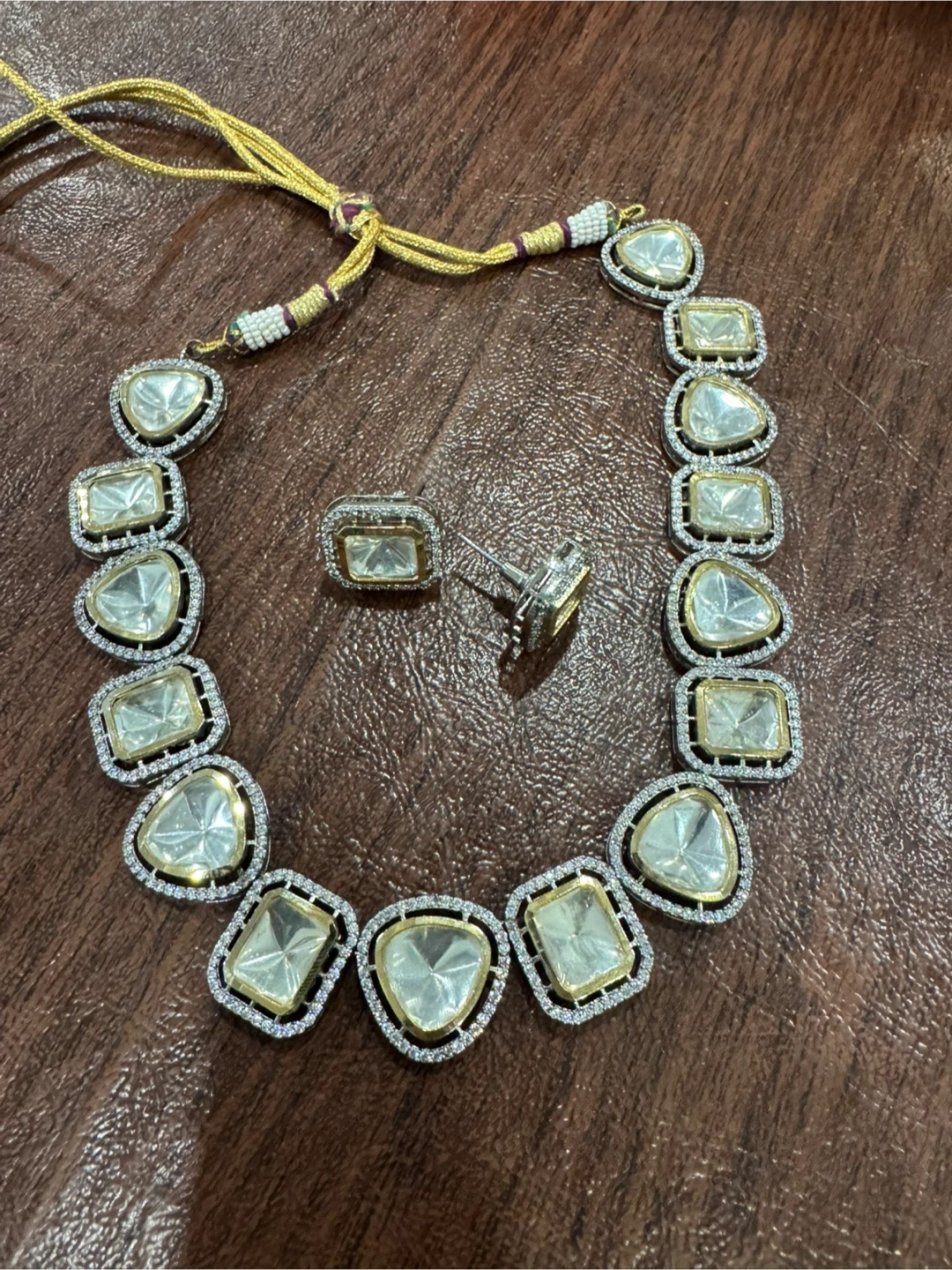 This set includes a statement necklace and matching stud earrings, both adorned with clear, faceted stones. The jewellery features a gold-tone finish with silver-tone accents around the stones. It's perfect for adding a touch of sparkle to formal occasions or special events.