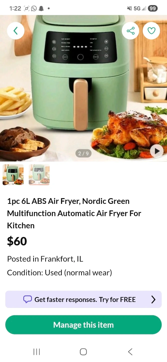 This is a 6L ABS air fryer in Nordic Green. It's a multifunction automatic air fryer for the kitchen. It's in used condition with normal wear.
