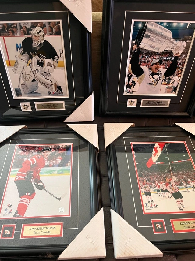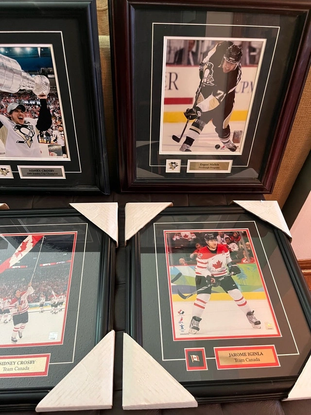Framed hockey collectibles featuring Luongo, Toews, Malkin, and Fleury. Located near McCowan and Sheppard area in Scarborough. Condition is Used - Good. Cash accepted.