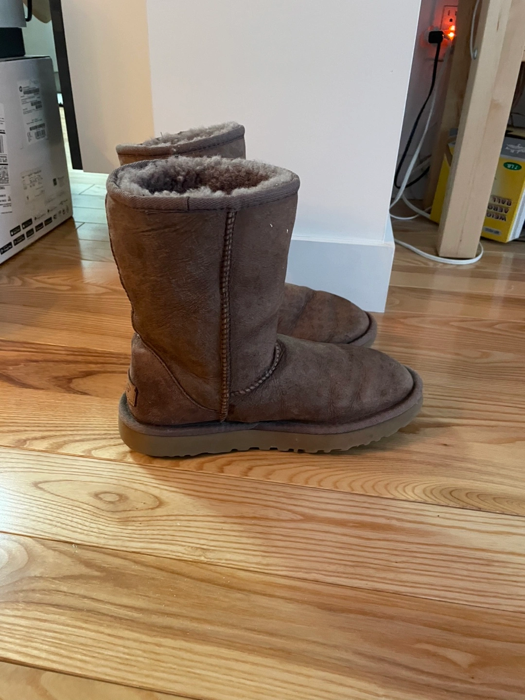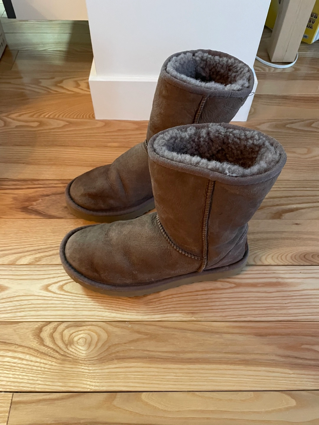 Classic UGG boots in a taupe colour. They're made with genuine sheepskin for ultimate comfort and warmth. These boots are in relived condition in a women's size 7.
