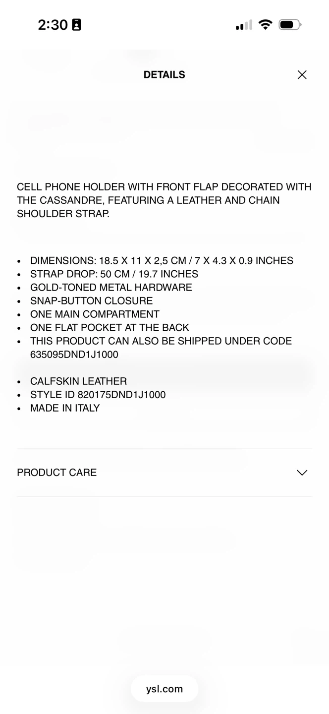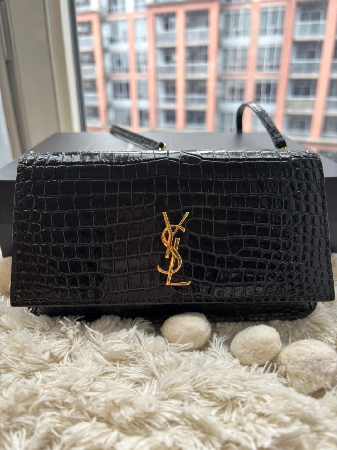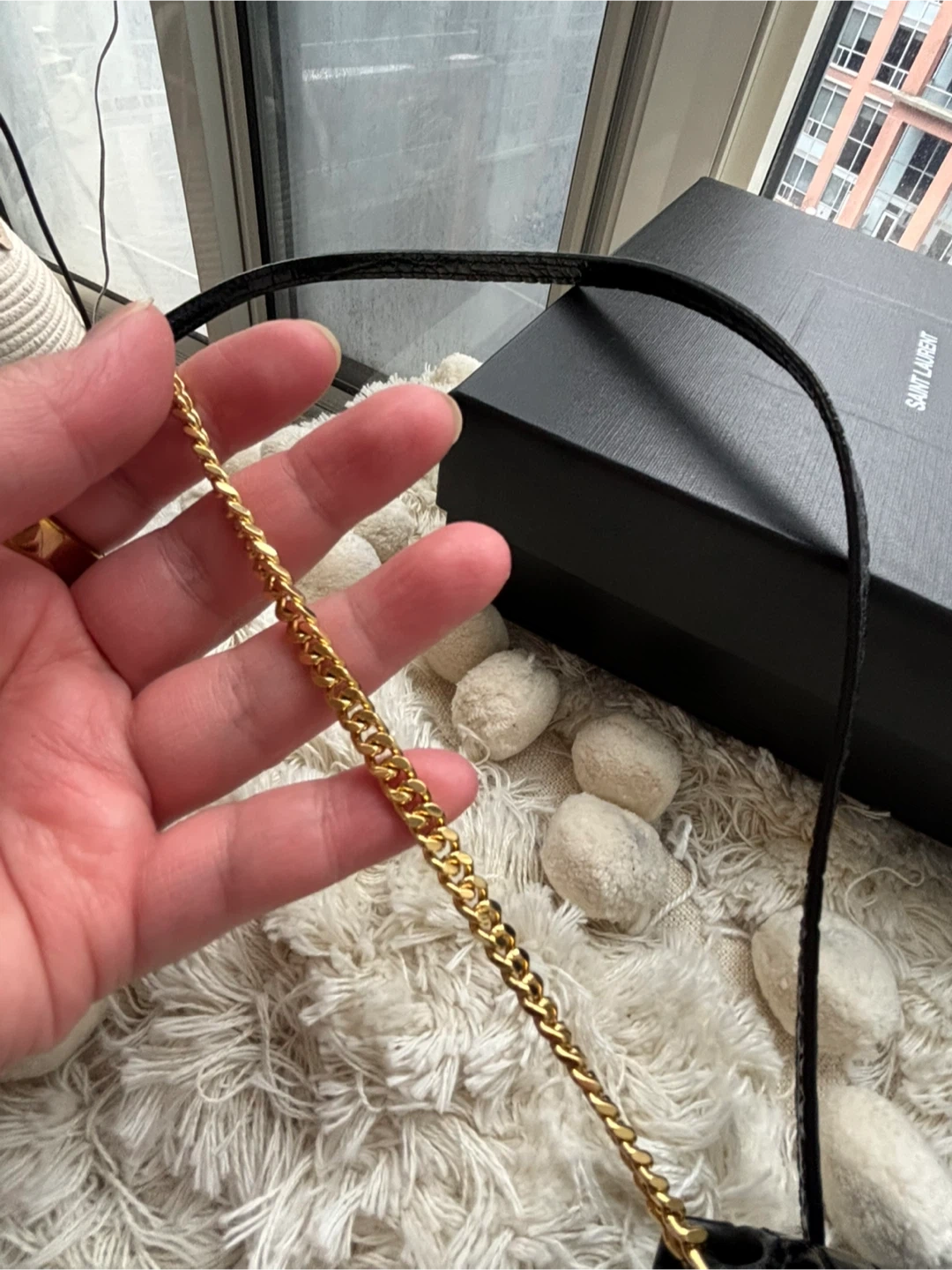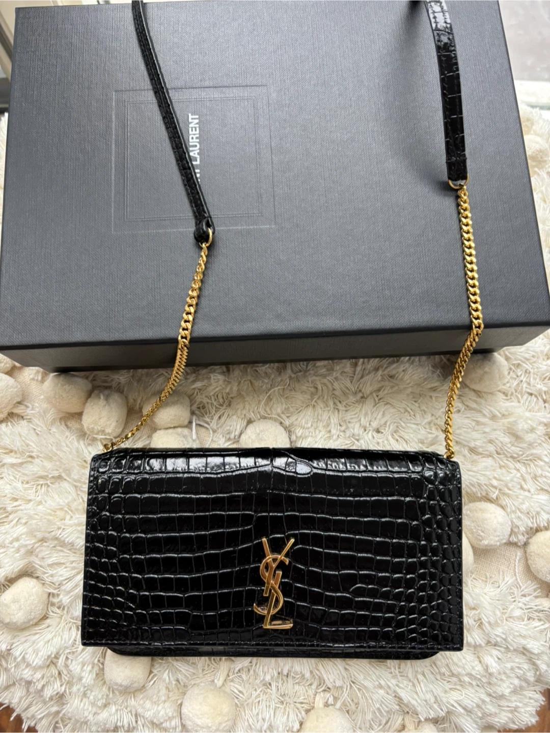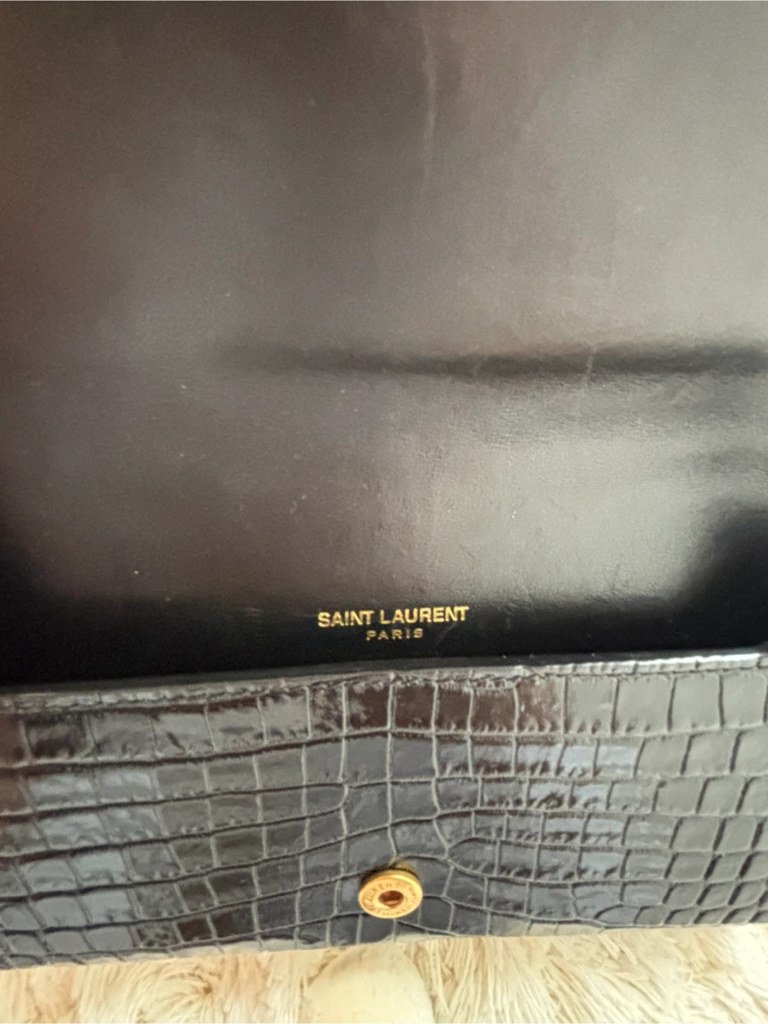 Elegant croc black phone holder by Saint Laurent. It features a gold-tone chain strap and the iconic YSL logo hardware. Sleek and versatile design.