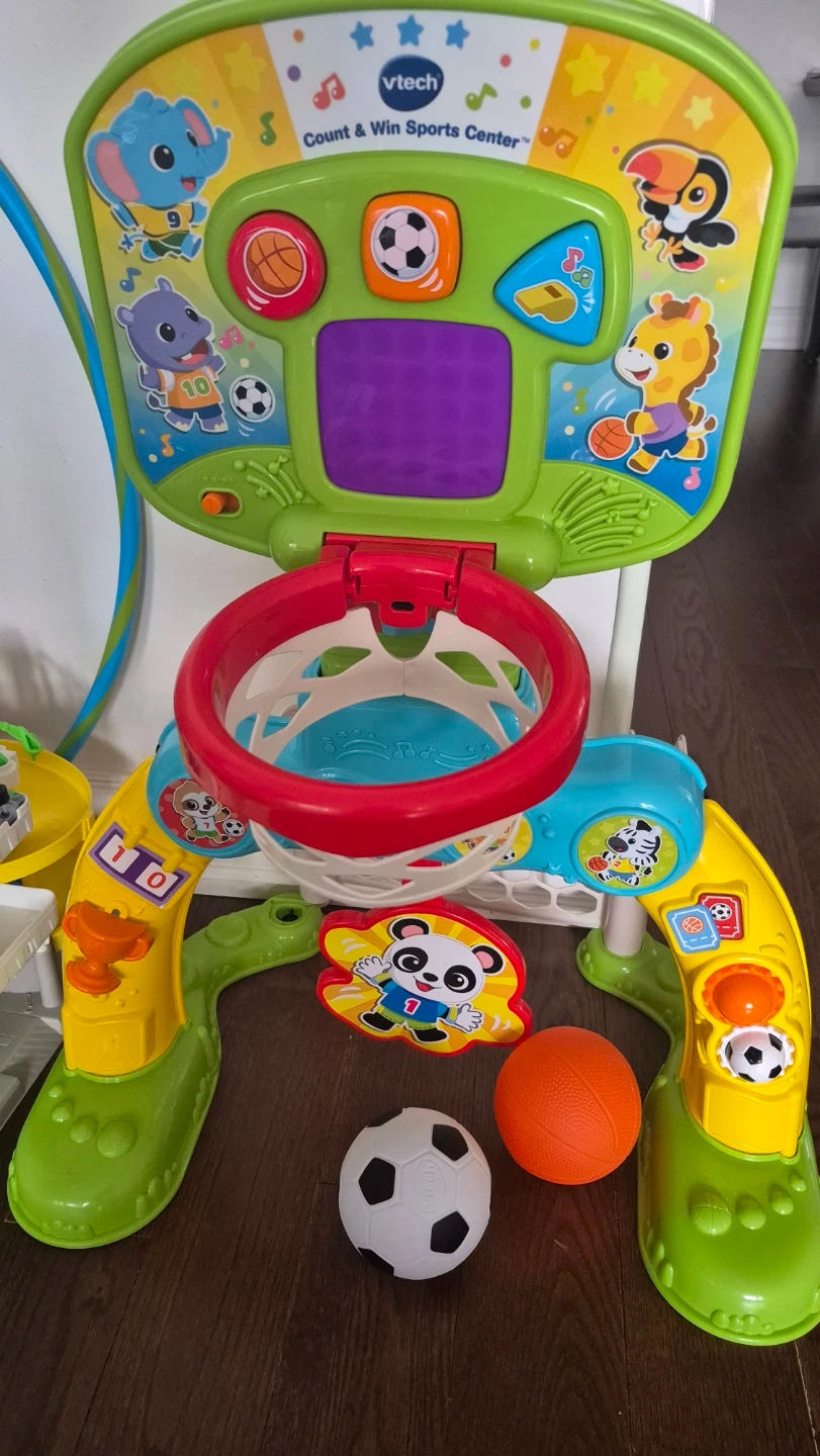 The VTech Count & Win Sports Center is a fun and educational toy for kids! It features a basketball hoop and a soccer net, along with interactive buttons and sounds to help children learn about numbers and sportsmanship. Perfect for active play and early development