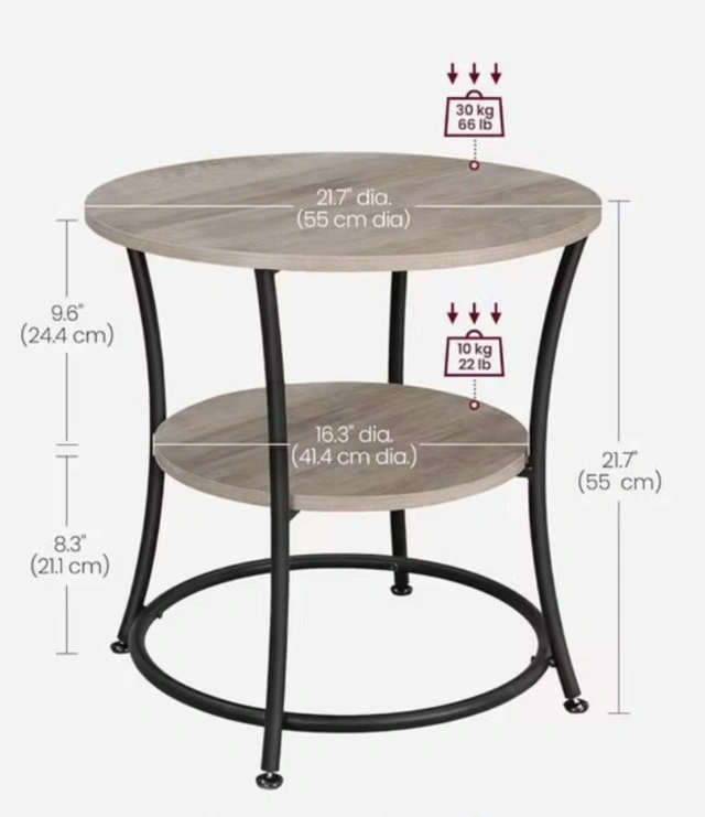 This is a brand new, side round end table with two shelves, model LET56BG, perfect for adding a touch of elegance and functionality to any room. The table features a sturdy construction with a stylish design. It's ideal for placing next to a sofa or bed to hold lamps, books, or decorative items. Specifications: Shape: Round, Number of Shelves: 2, Colour: Beige / Black, Top shelf weight capacity: 66lbs, Bottom shelf weight capacity: 22lbs, Top shelf diameter: 21.7 inches, Bottom shelf diameter: 16.3 inches. If the ad is up, the table is available! Cash accepted.