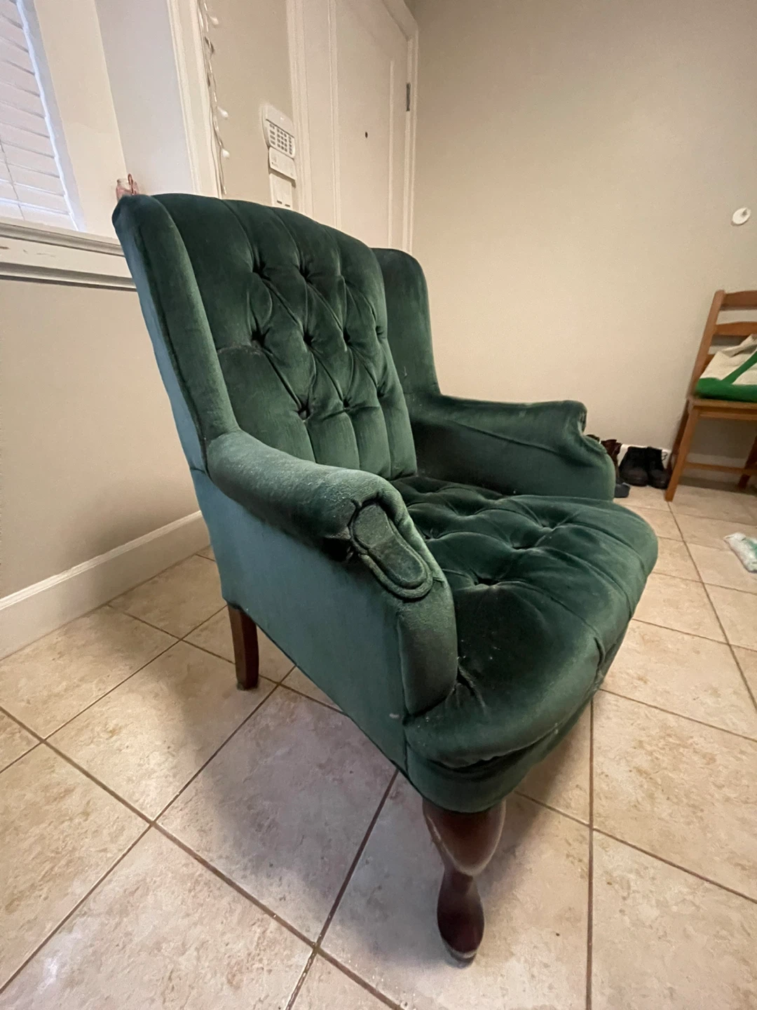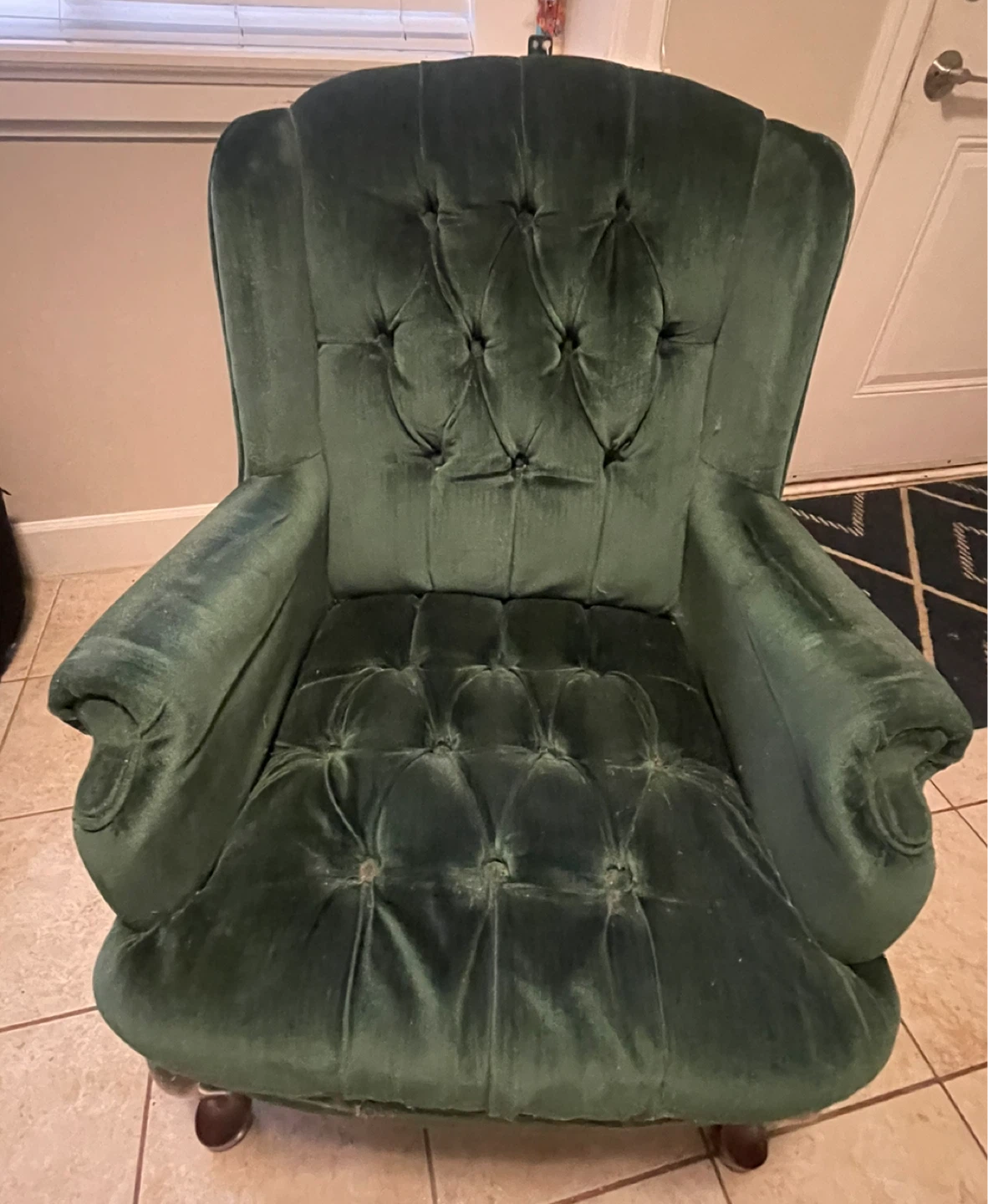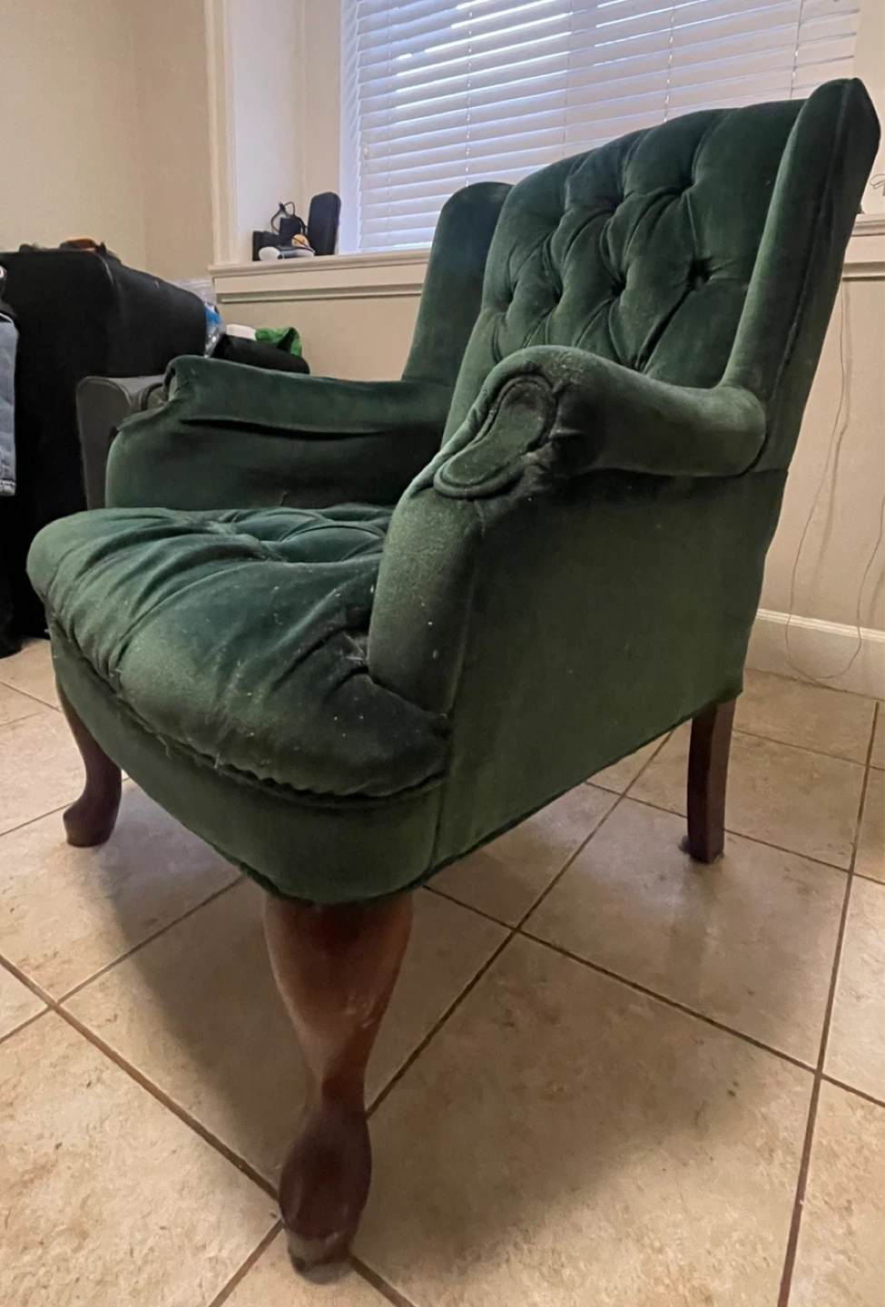 This armchair is upholstered in a deep green velvet like fabric. It features button tufting on the back and seat, with wooden legs. It's a comfortable accent piece for any room.
