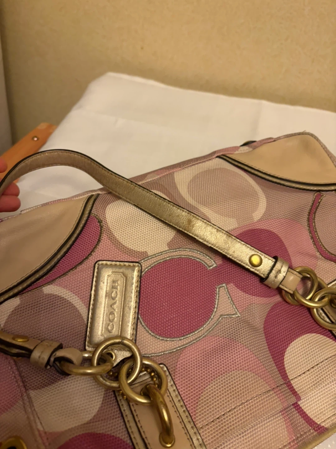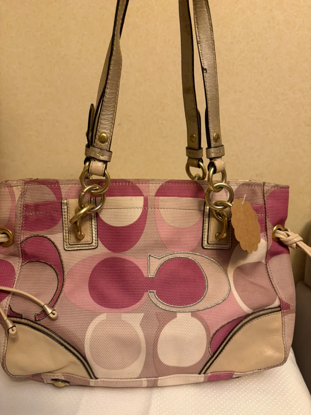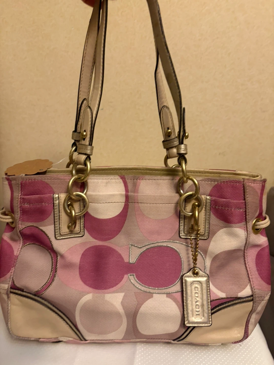 Coach tote bag with the signature 'C' pattern. Features pink and multi-colored fabric with tan leather trim and gold hardware. It's a stylish accessory for everyday use! Hardware and handles in ok condition . Inside is very clean .