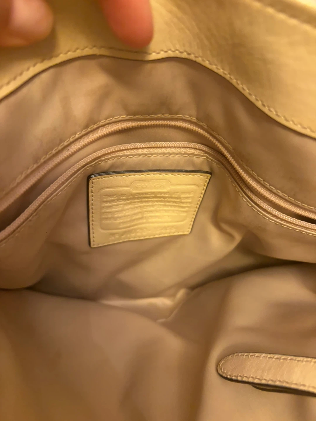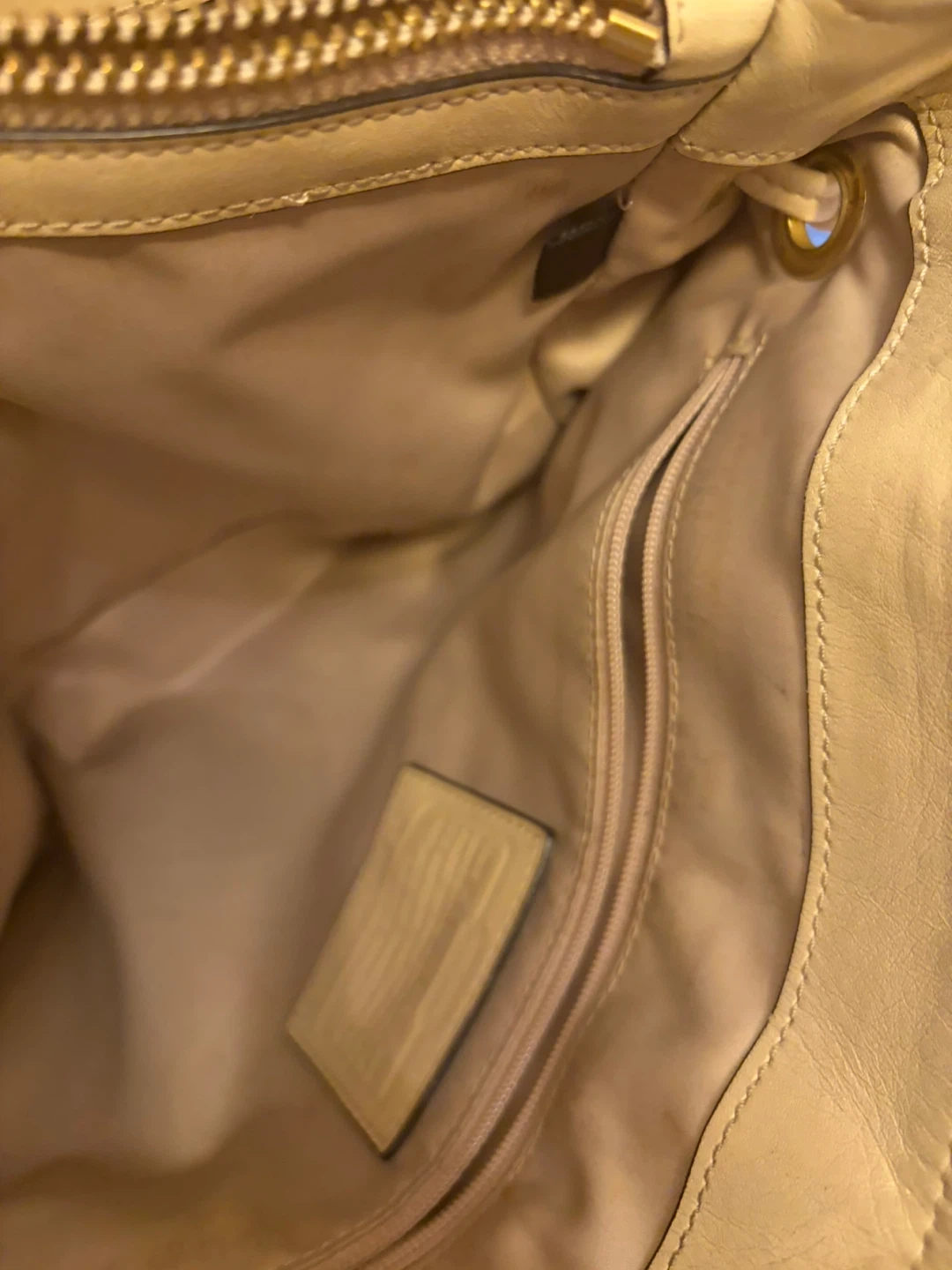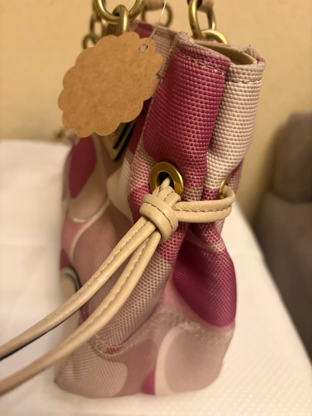 Coach tote bag with the signature 'C' pattern. Features pink and multi-colored fabric with tan leather trim and gold hardware. It's a stylish accessory for everyday use! Hardware and handles in ok condition . Inside is very clean .