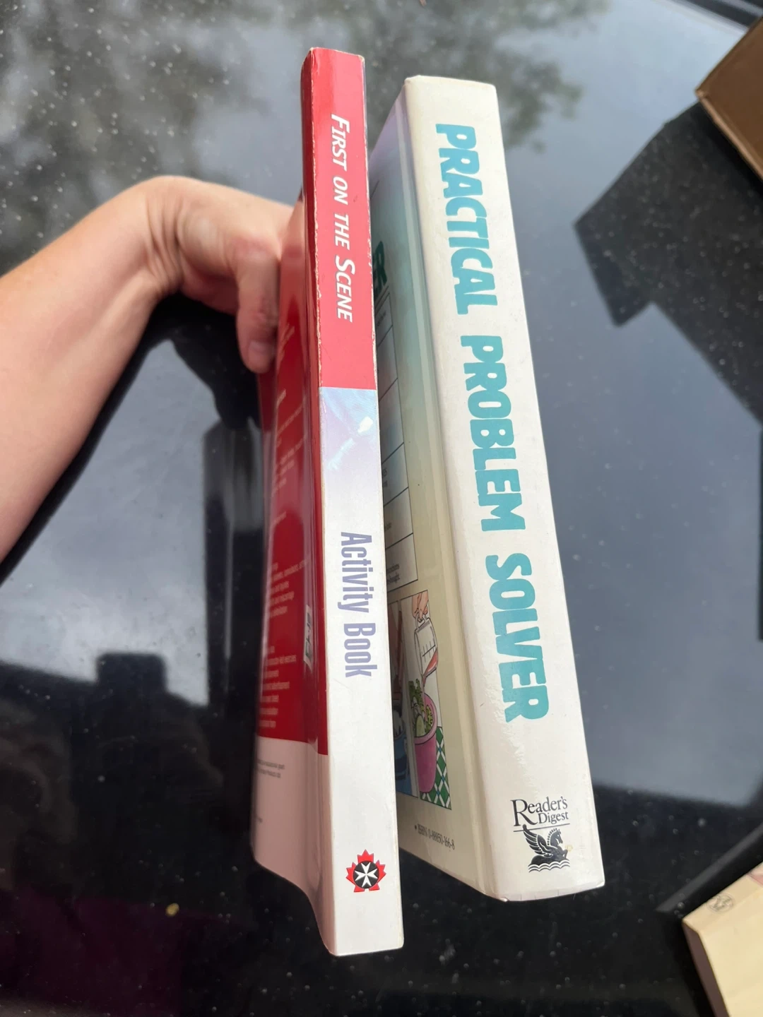 Selling two books. One is the Reader's Digest Practical Problem Solver, filled with substitutes, shortcuts, and ingenious solutions for making life easier. The other is a First On The Scene Activity Book. $5 each.