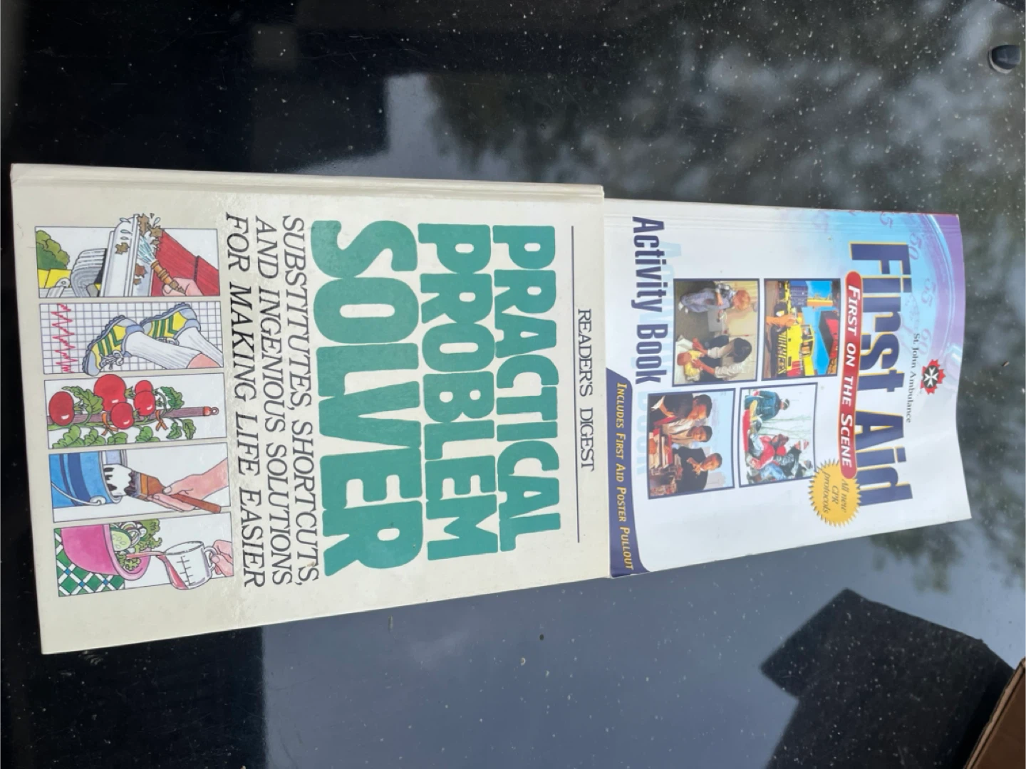 Selling two books. One is the Reader's Digest Practical Problem Solver, filled with substitutes, shortcuts, and ingenious solutions for making life easier. The other is a First On The Scene Activity Book. $5 each.