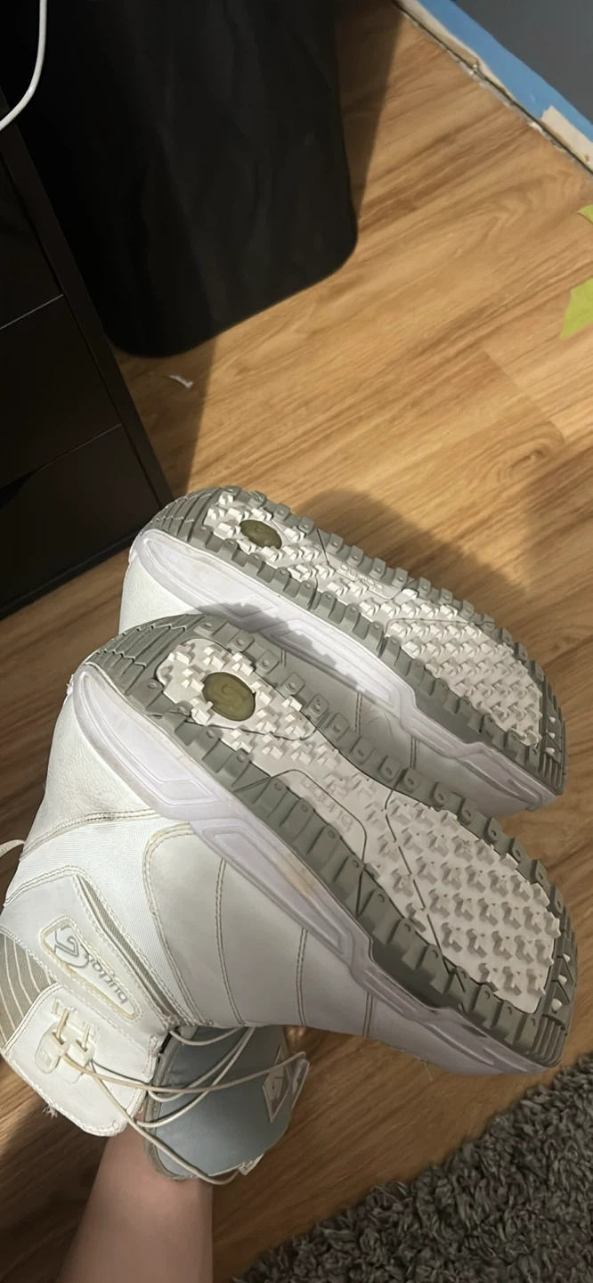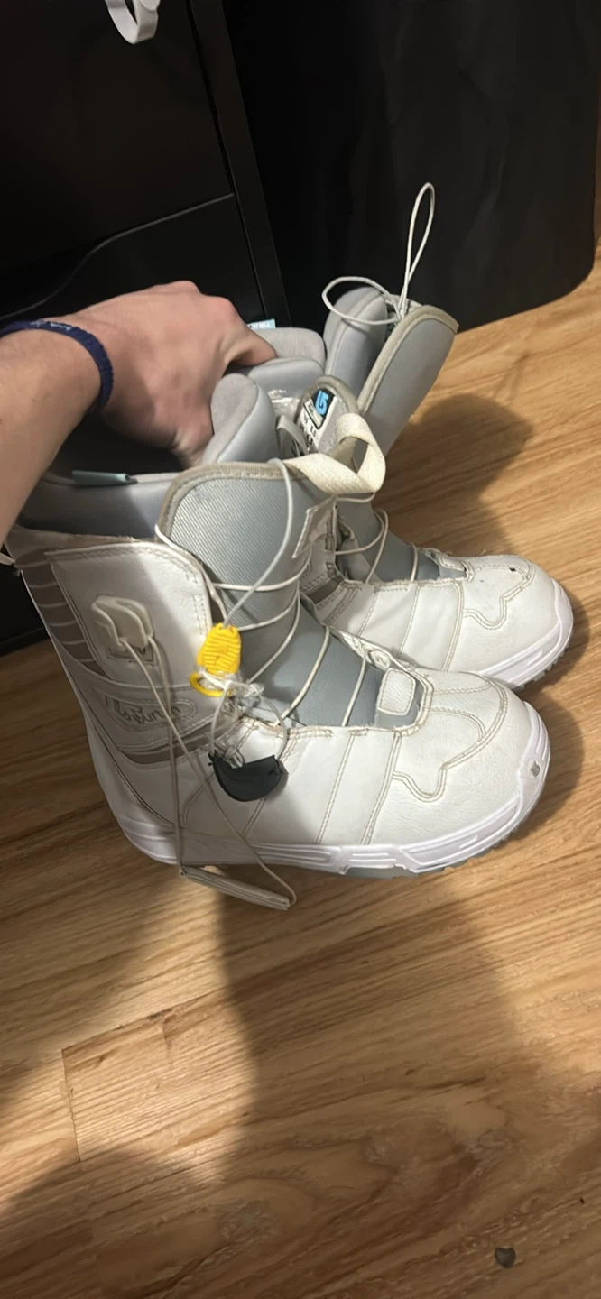 White Burton Mint snowboard boots. Women's US size 8.5 (EUR 40.5). These boots feature a comfortable liner and secure lacing system for your rides. Great for hitting the slopes!