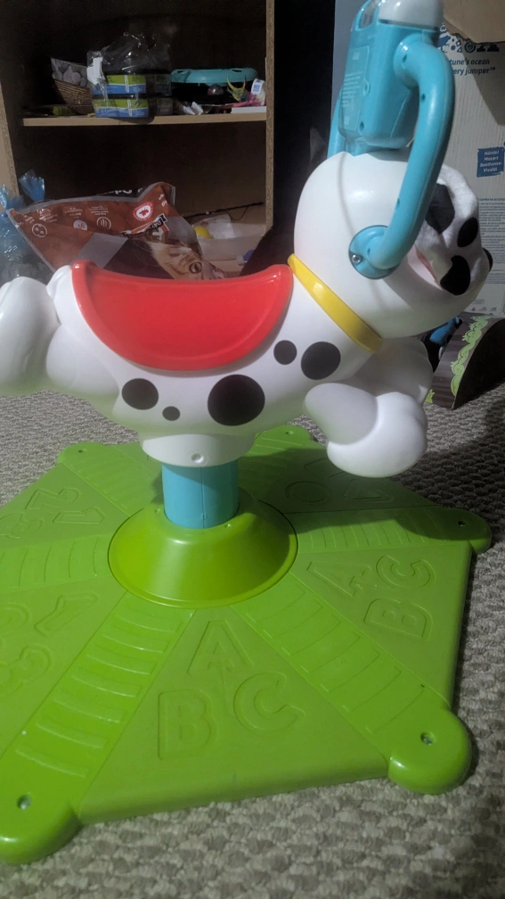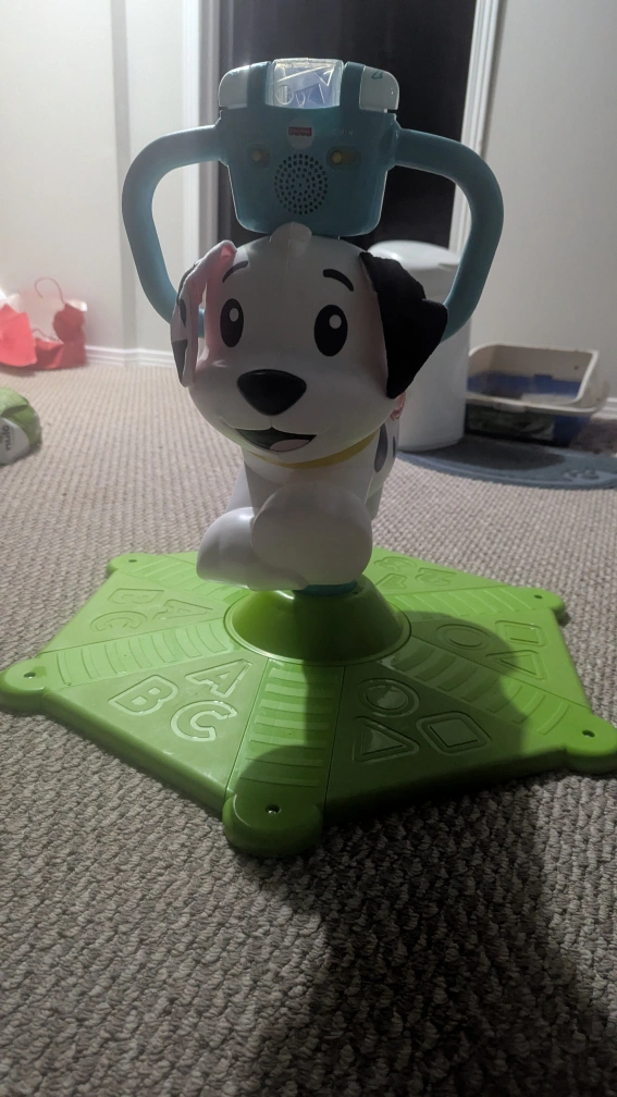 Puppy plays music and bilingual educational content (in English and French) as baby bounces or spins 360 degrees