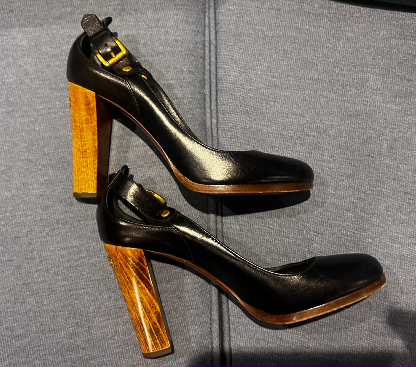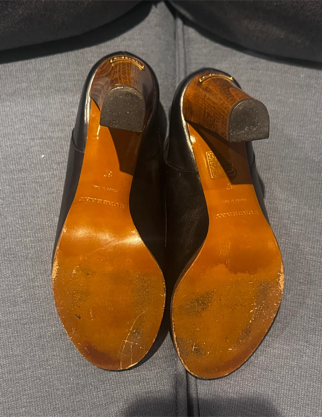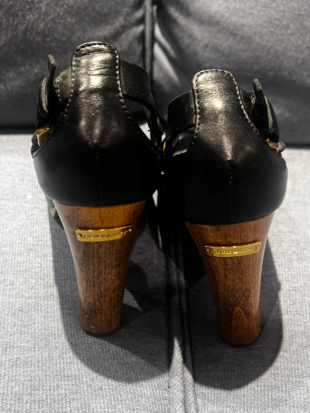 Burberry pumps feature black leather and a distinctive wood heel. Made in Italy, they're a size 37. The heel has a gold-tone accent