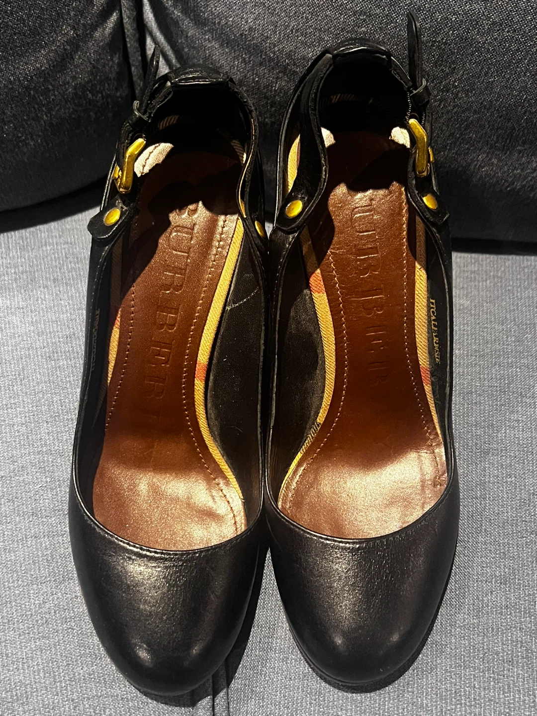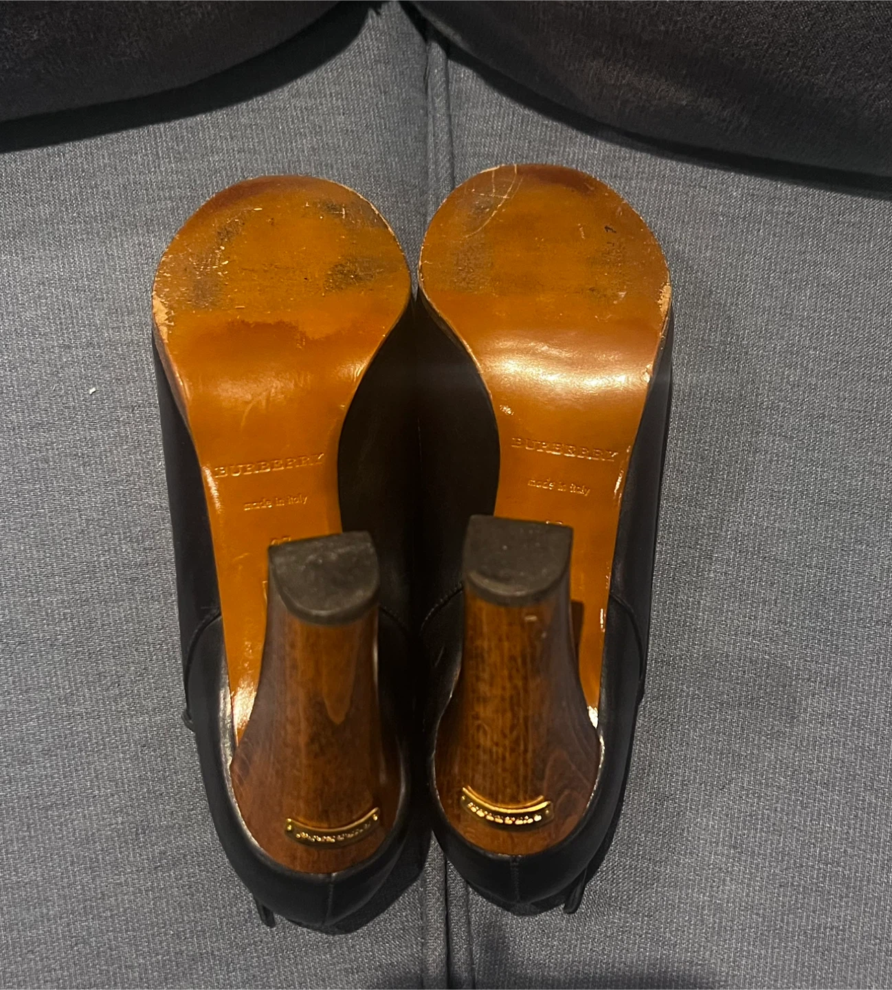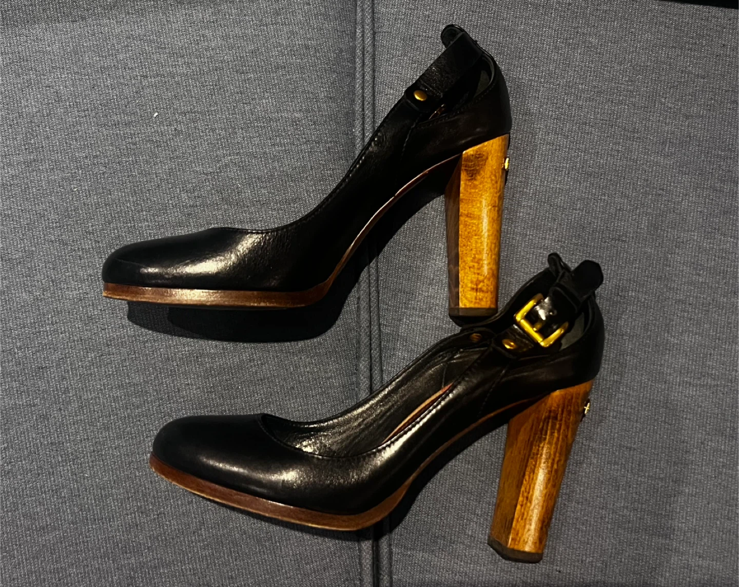 Burberry pumps feature black leather and a distinctive wood heel. Made in Italy, they're a size 37. The heel has a gold-tone accent