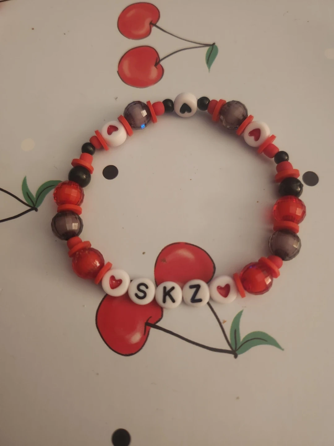 Handmade stretchy bracelets featuring 'SKZ' letter beads for the KPOP group STRAY KIDS. Assorted colours and designs, including red, black, white, and clear red beads. Perfect for fans!