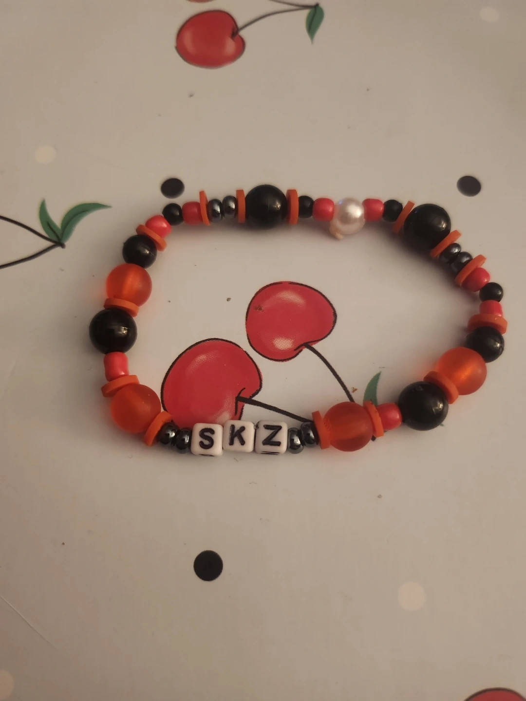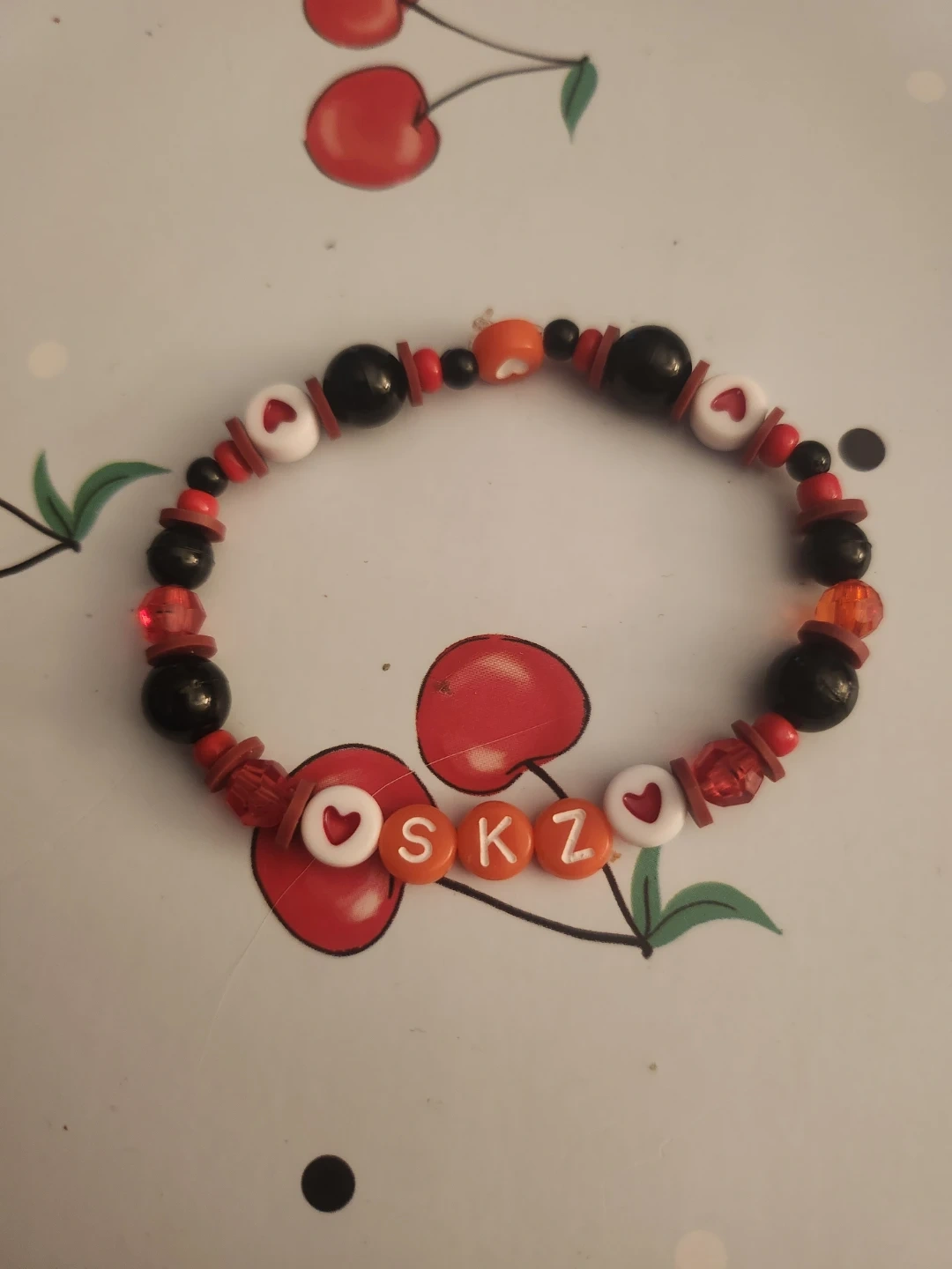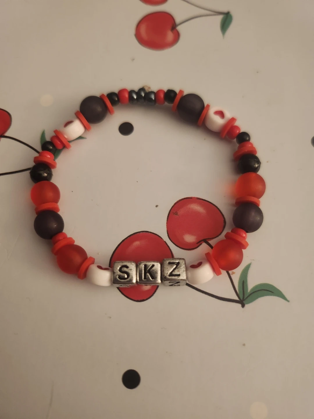 Handmade stretchy bracelets featuring 'SKZ' letter beads for the KPOP group STRAY KIDS. Assorted colours and designs, including red, black, white, and clear red beads. Perfect for fans!