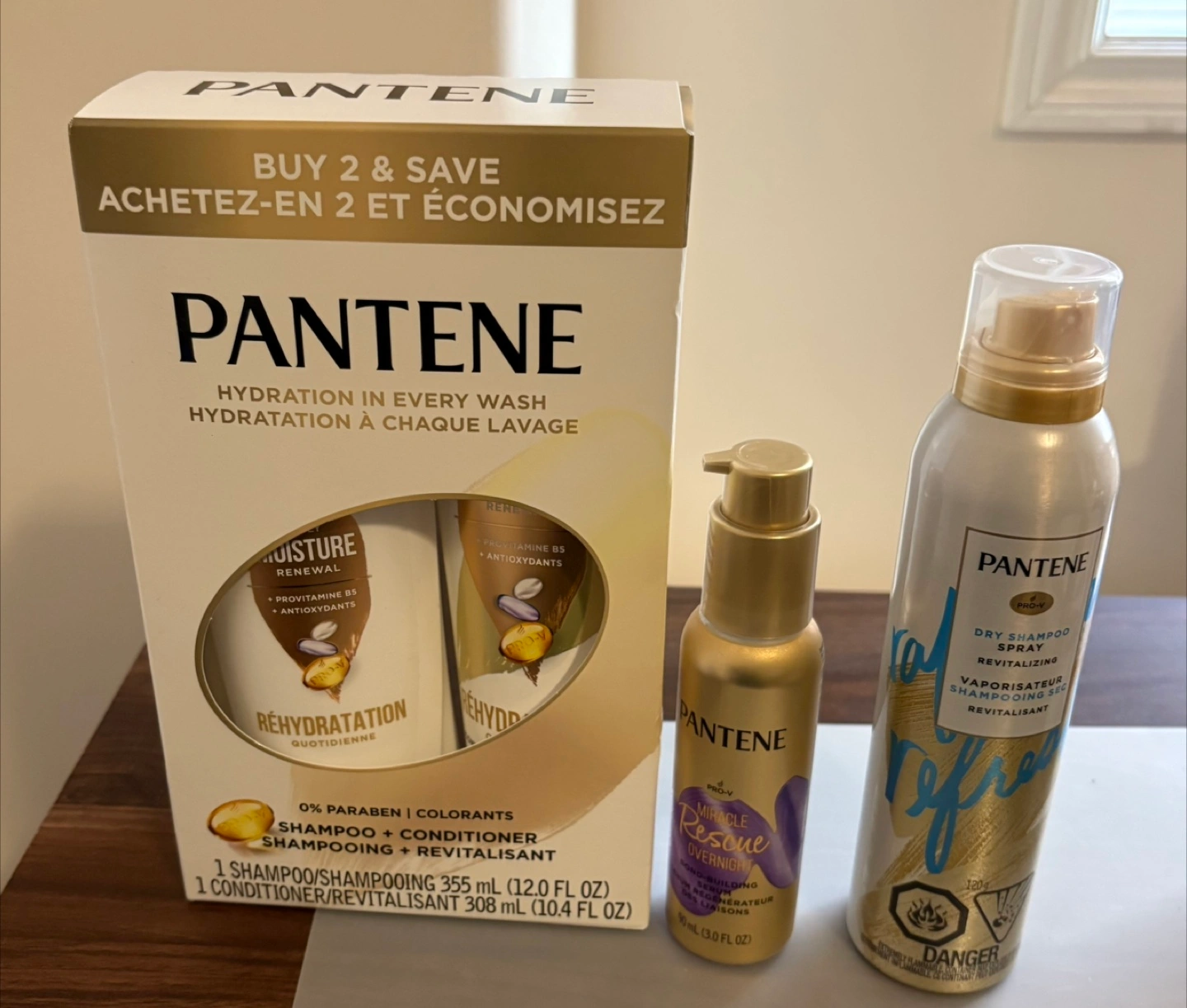 Pantene hair care bundle. Includes large size shampoo 355ml and conditioner 308ml, dry shampoo spray, and overnight serum. Hydration in every wash.