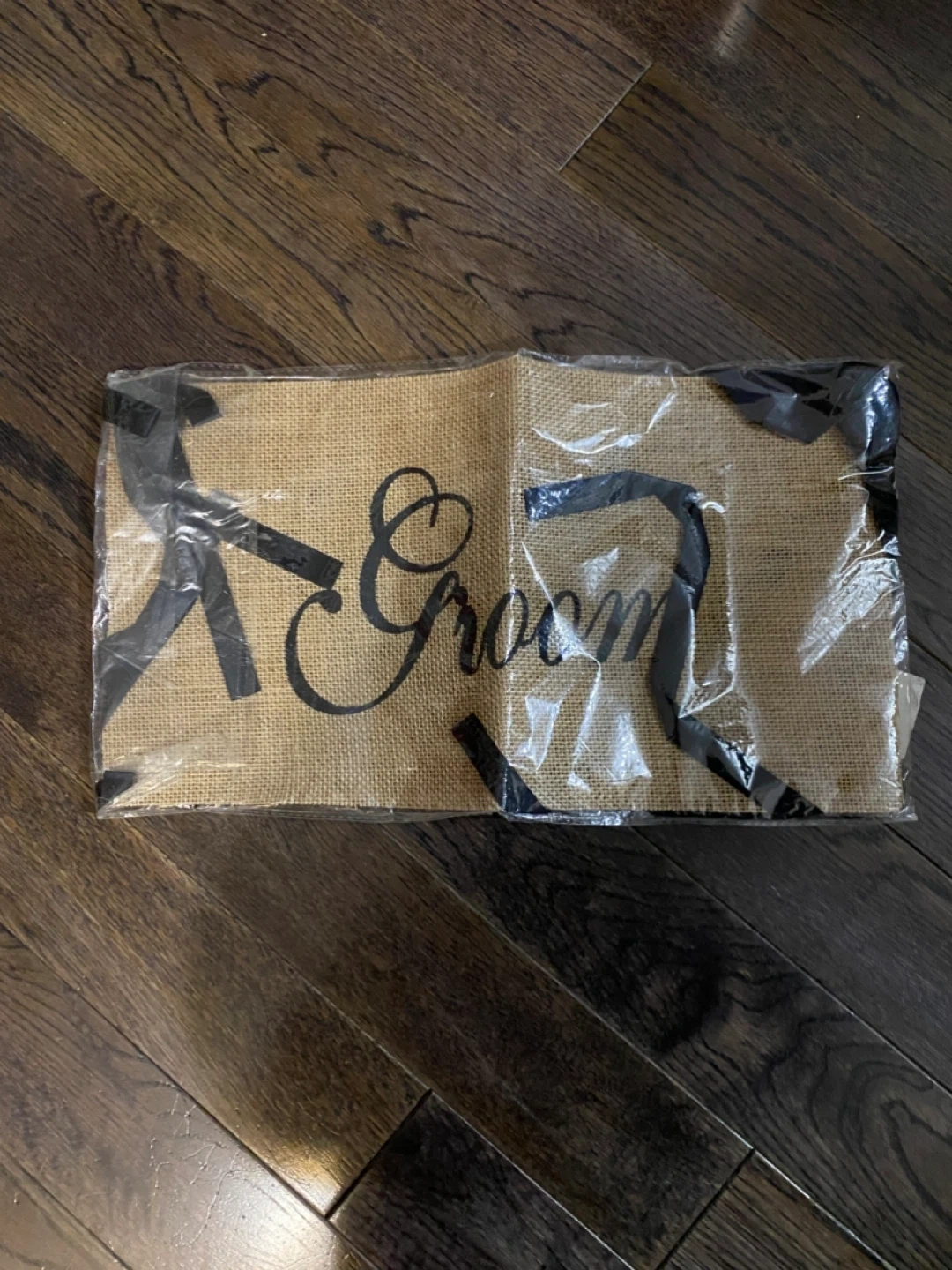 Set of two burlap sashes, one for the bride and one for the groom. Reads "Bride" and "Groom" in black script. Perfect for wedding photos or reception entrances! These sashes add a touch of rustic charm to your special day.