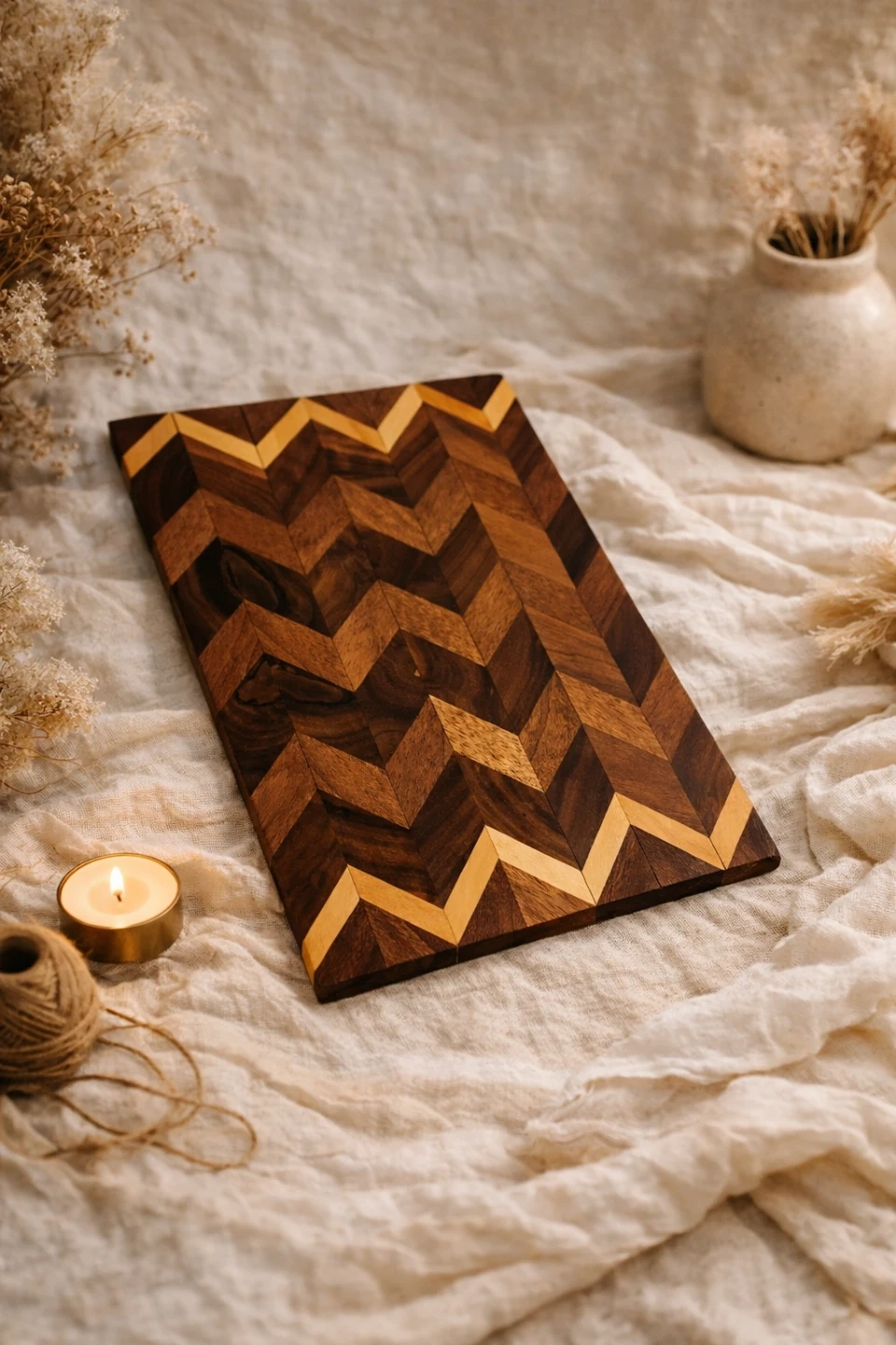 Beautiful wood cutting board with a stylish chevron pattern. It's perfect for adding a touch of elegance to your kitchen while being functional for all your chopping needs