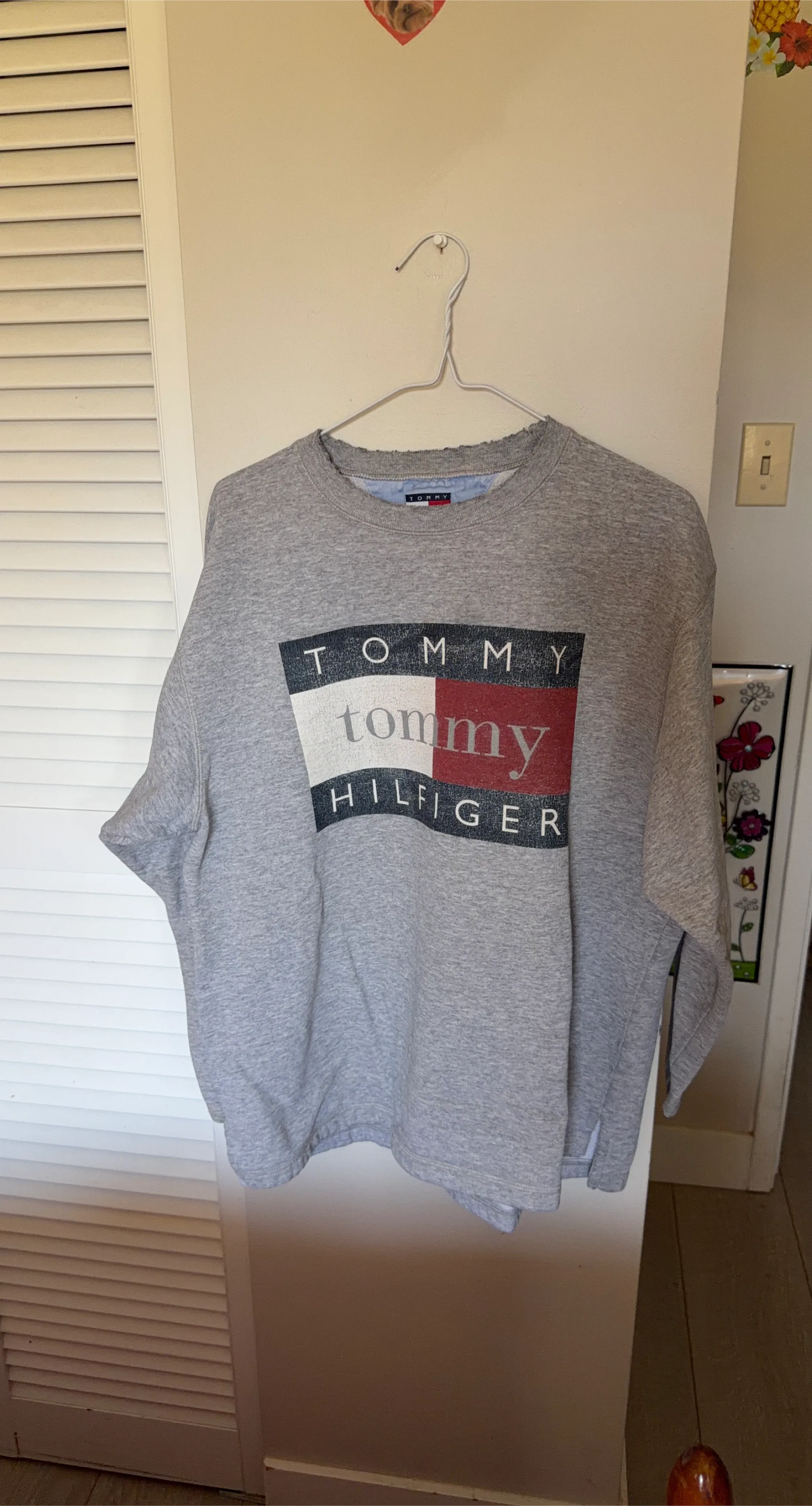 Tommy Hilfiger grey sweatshirt in good condition! The size and material are not specified, but it has the classic Tommy Hilfiger logo on the front