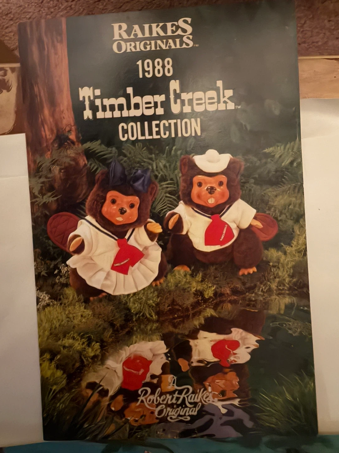 This is a vintage Raikes Originals 1988 Timber Creek Collection beaver plush toy. It comes with its original box and certificate of authenticity. The plush is dressed in a sailor outfit with a red sash.