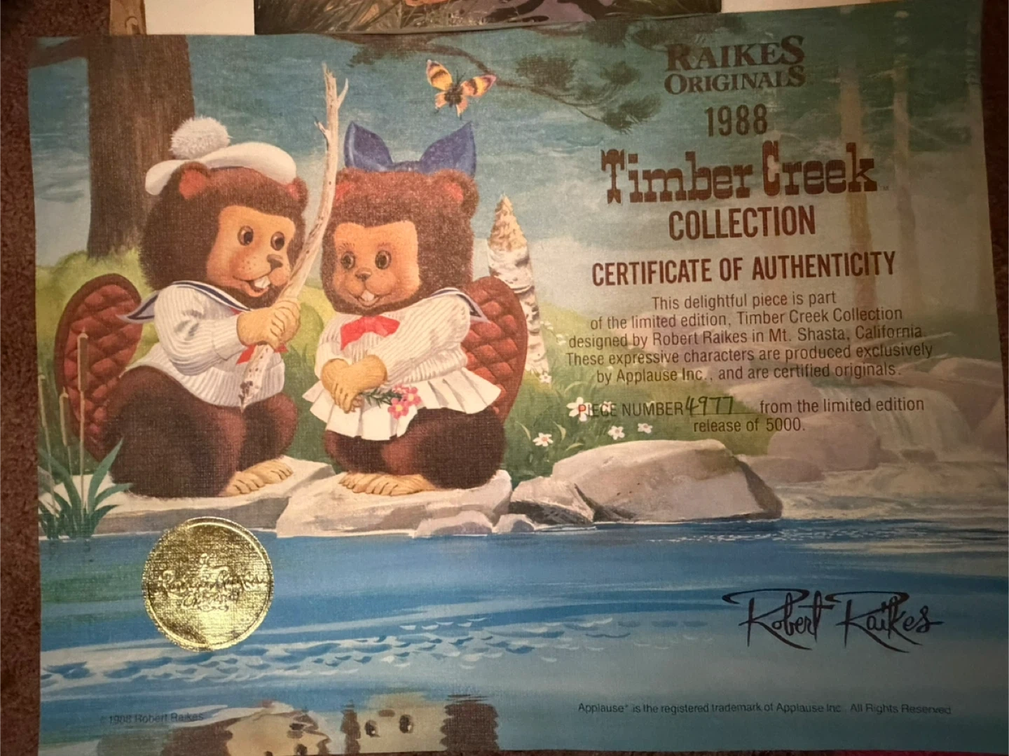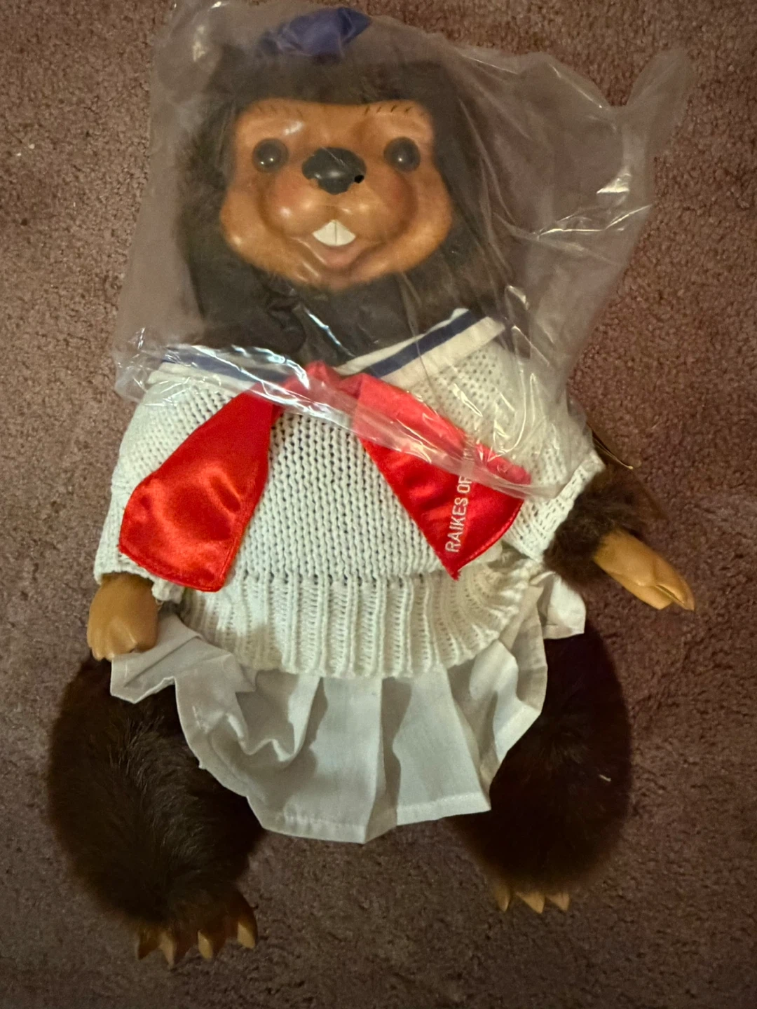 This is a vintage Raikes Originals 1988 Timber Creek Collection beaver plush toy. It comes with its original box and certificate of authenticity. The plush is dressed in a sailor outfit with a red sash.