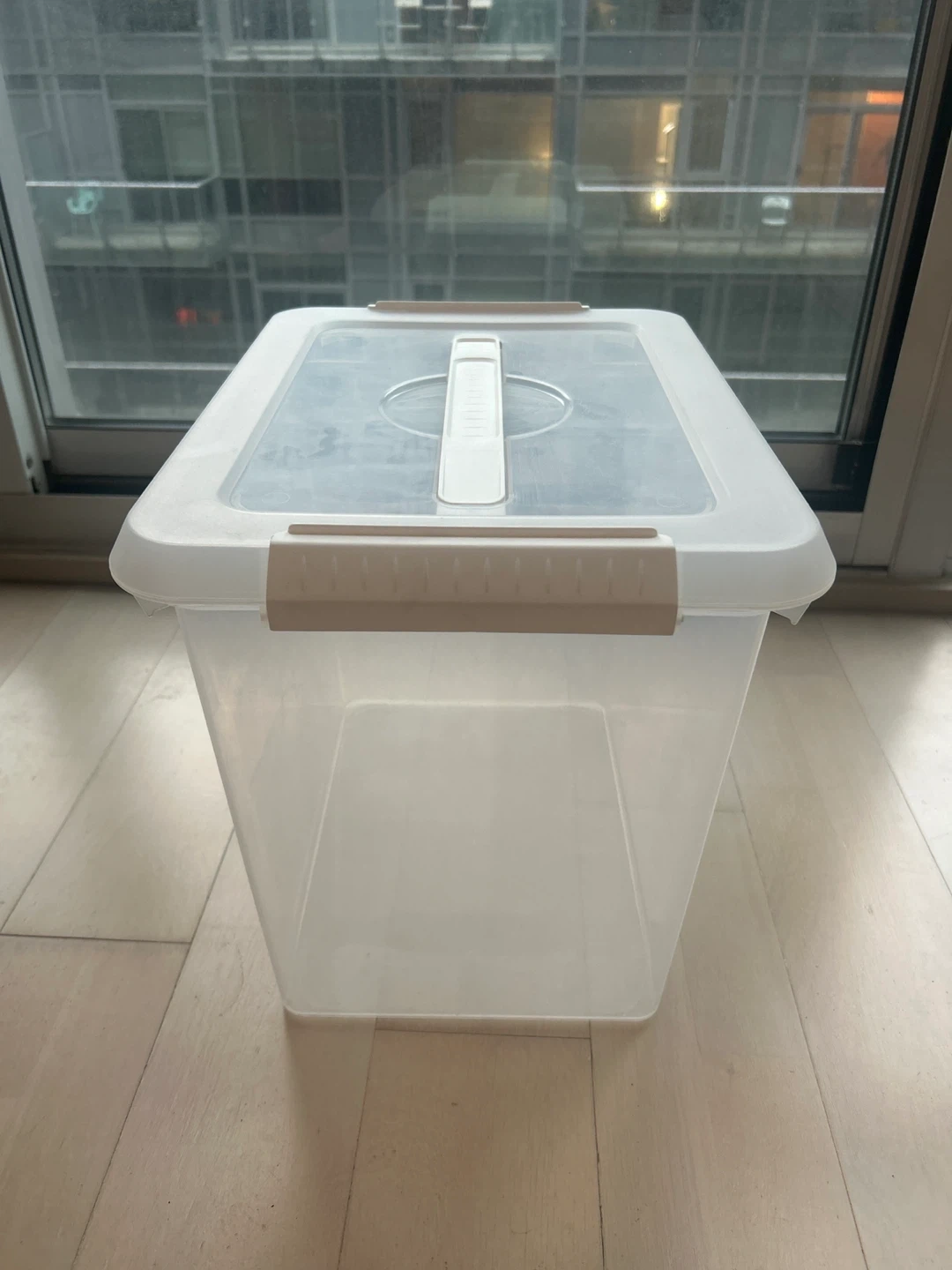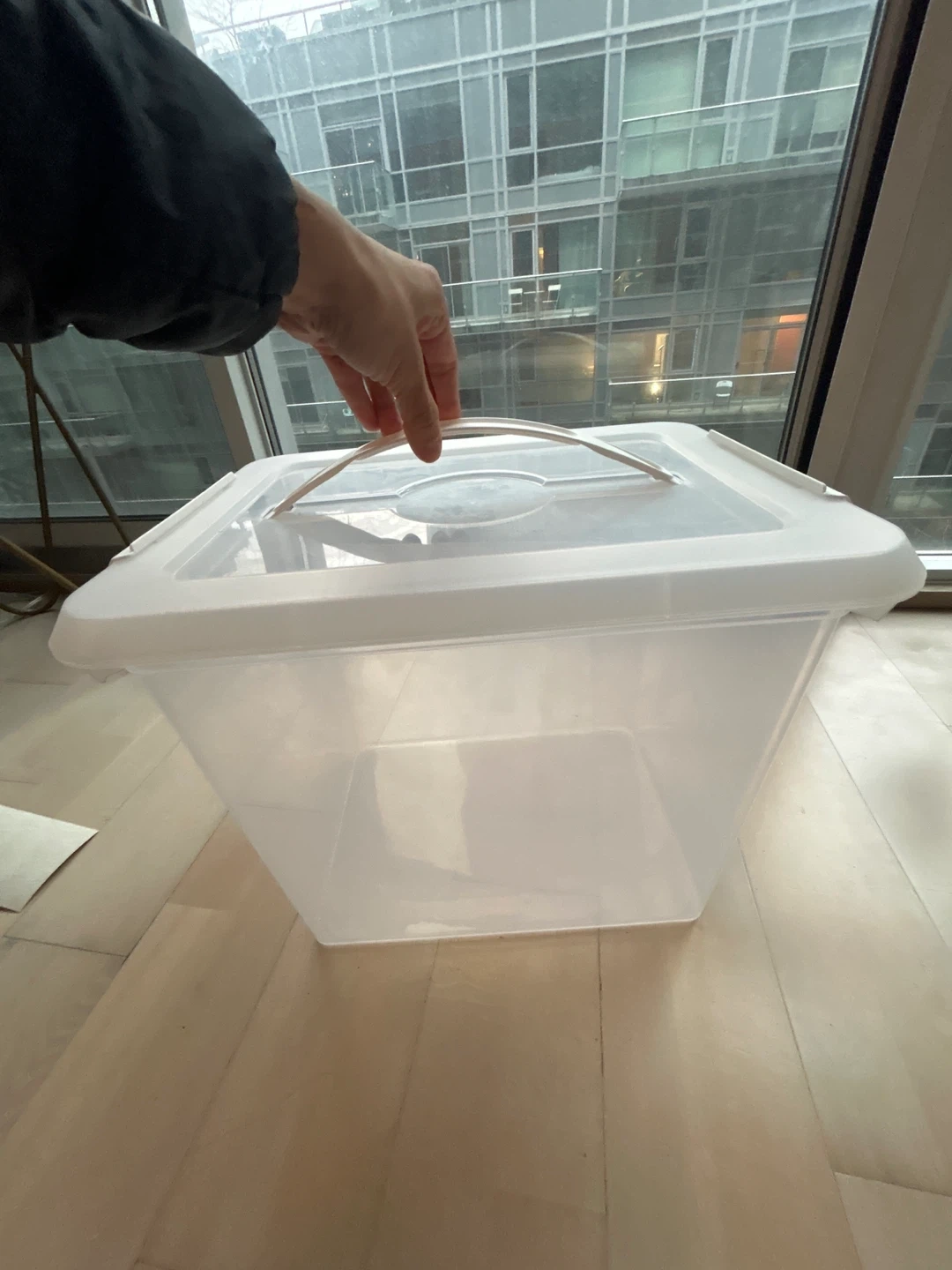 This is a clear plastic storage bin with a hinged lid and a handle. It's perfect for organizing various items around the house. The transparent design makes it easy to see what's inside.