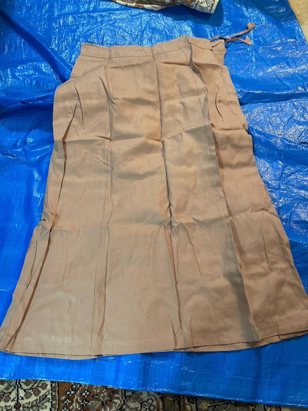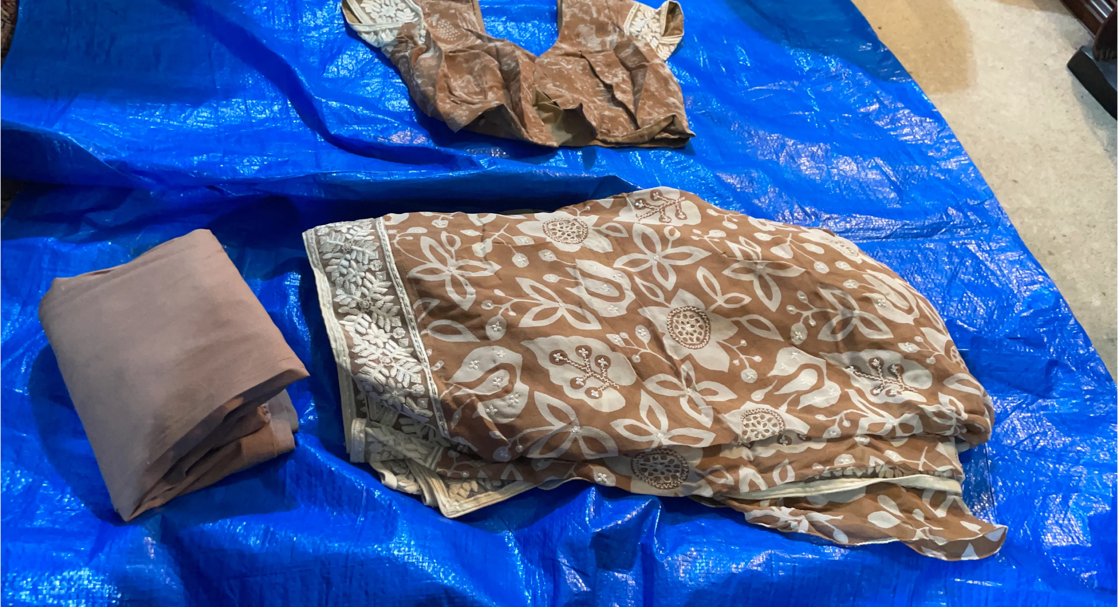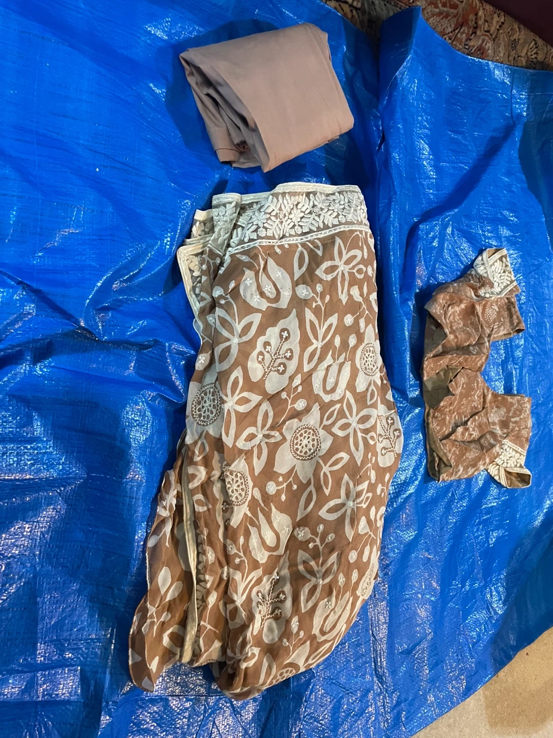 Selling a brown sari with a floral pattern and a matching blouse piece. It's in good condition and ready to wear!