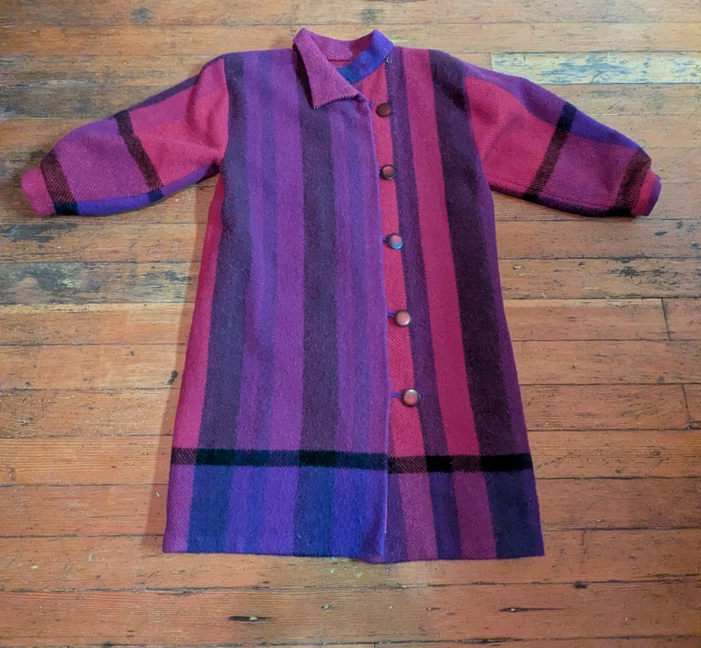 This Vintage Astrid Gjerlaug "Original" coat features a bold pink and purple plaid pattern. It's a unique piece with a button-up front. This coat would be great for adding a pop of colour to any outfit!