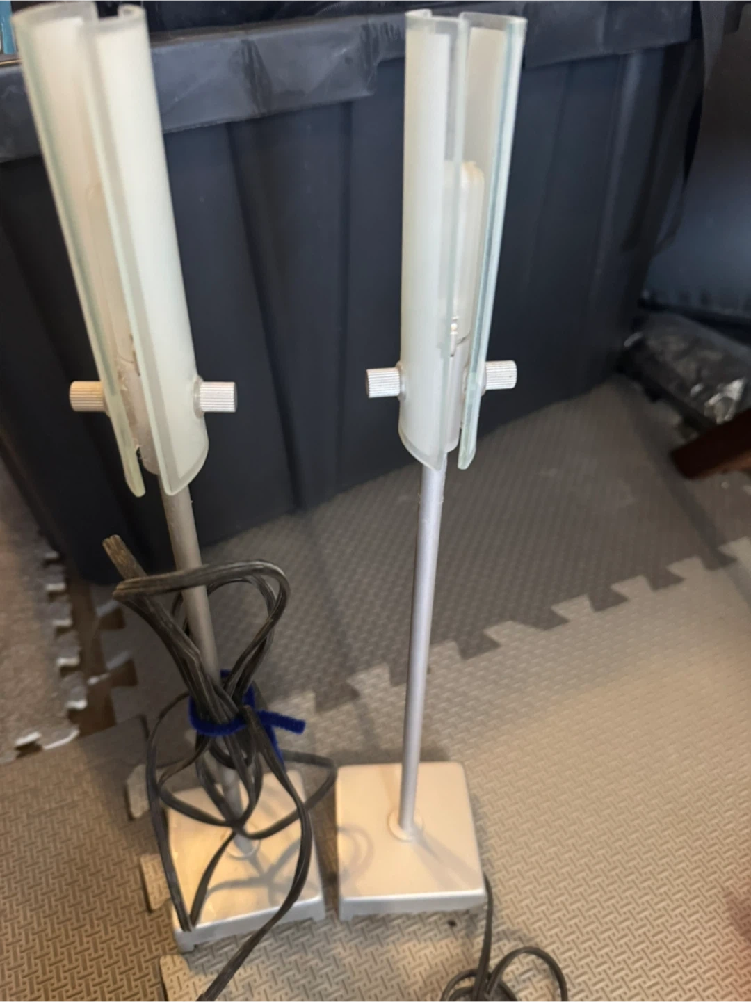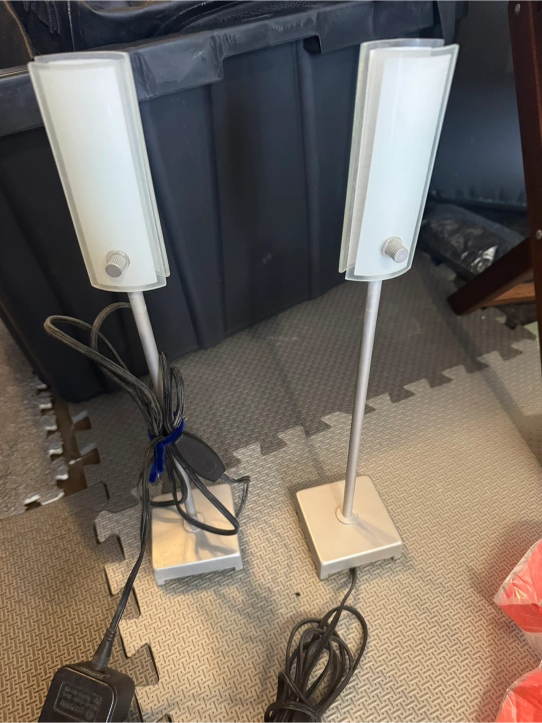 Two matching modern table lamps. Frosted glass shades on silver-toned metal stands. Each lamp has a square base and a cord with an inline switch. They're great for adding ambient lighting to a desk or nightstand.