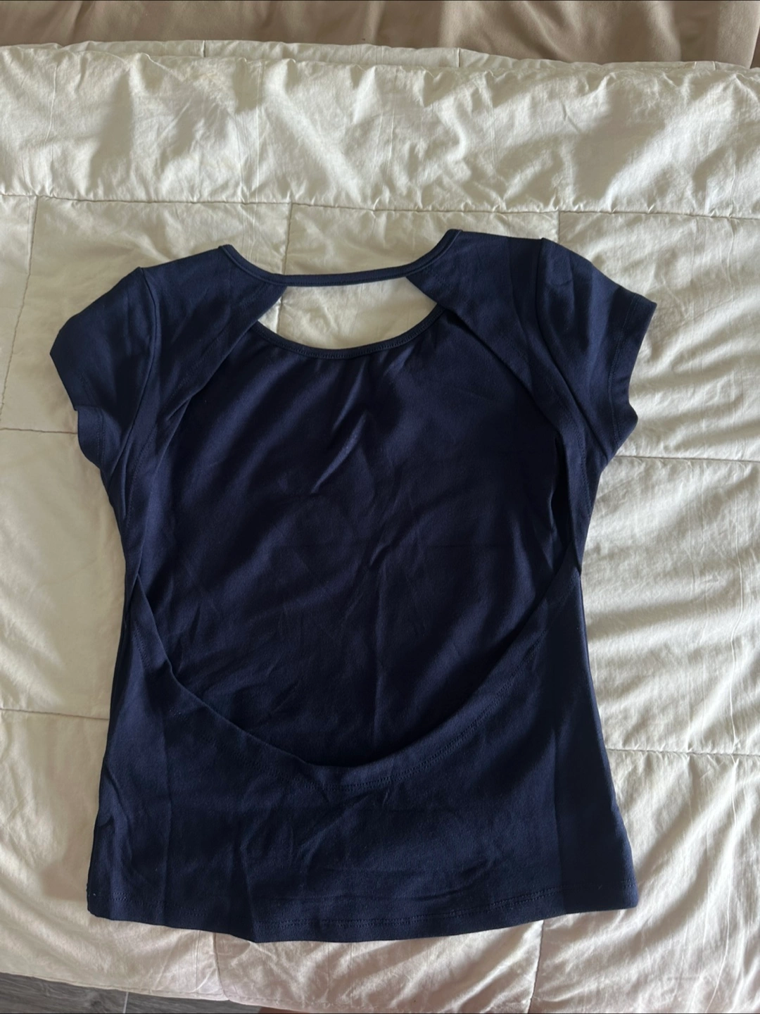 A great blue shirt with a cut-out back design. Short sleeves. Features the word 'love' on the front. This is an easy shirt to wear while going for a relaxing walk in the park.