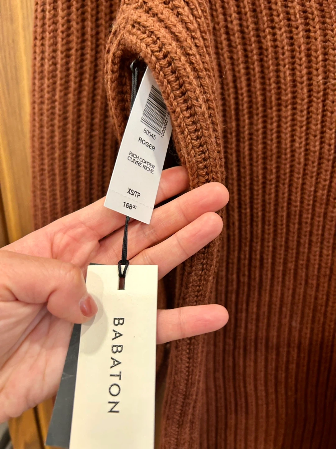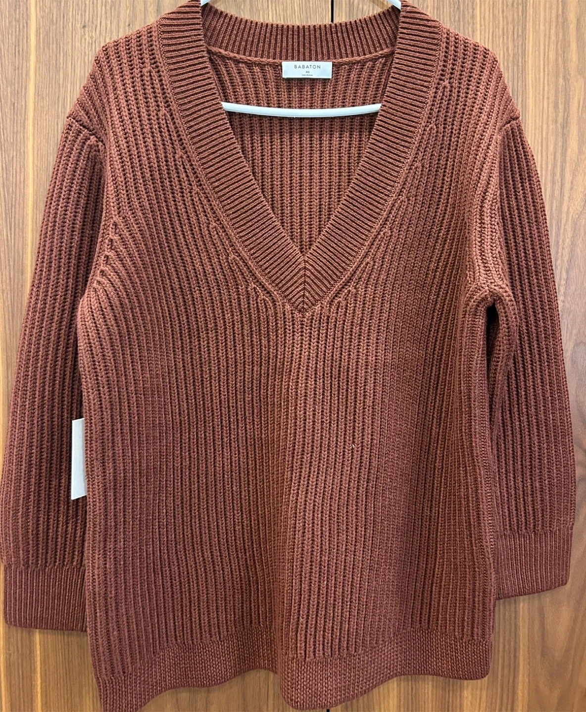 This is a Babaton Roger sweater in rich copper. It's a V-neck style with a ribbed knit texture. The size is XS.