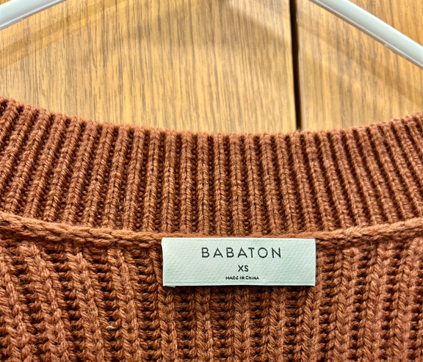 This is a Babaton Roger sweater in rich copper. It's a V-neck style with a ribbed knit texture. The size is XS.