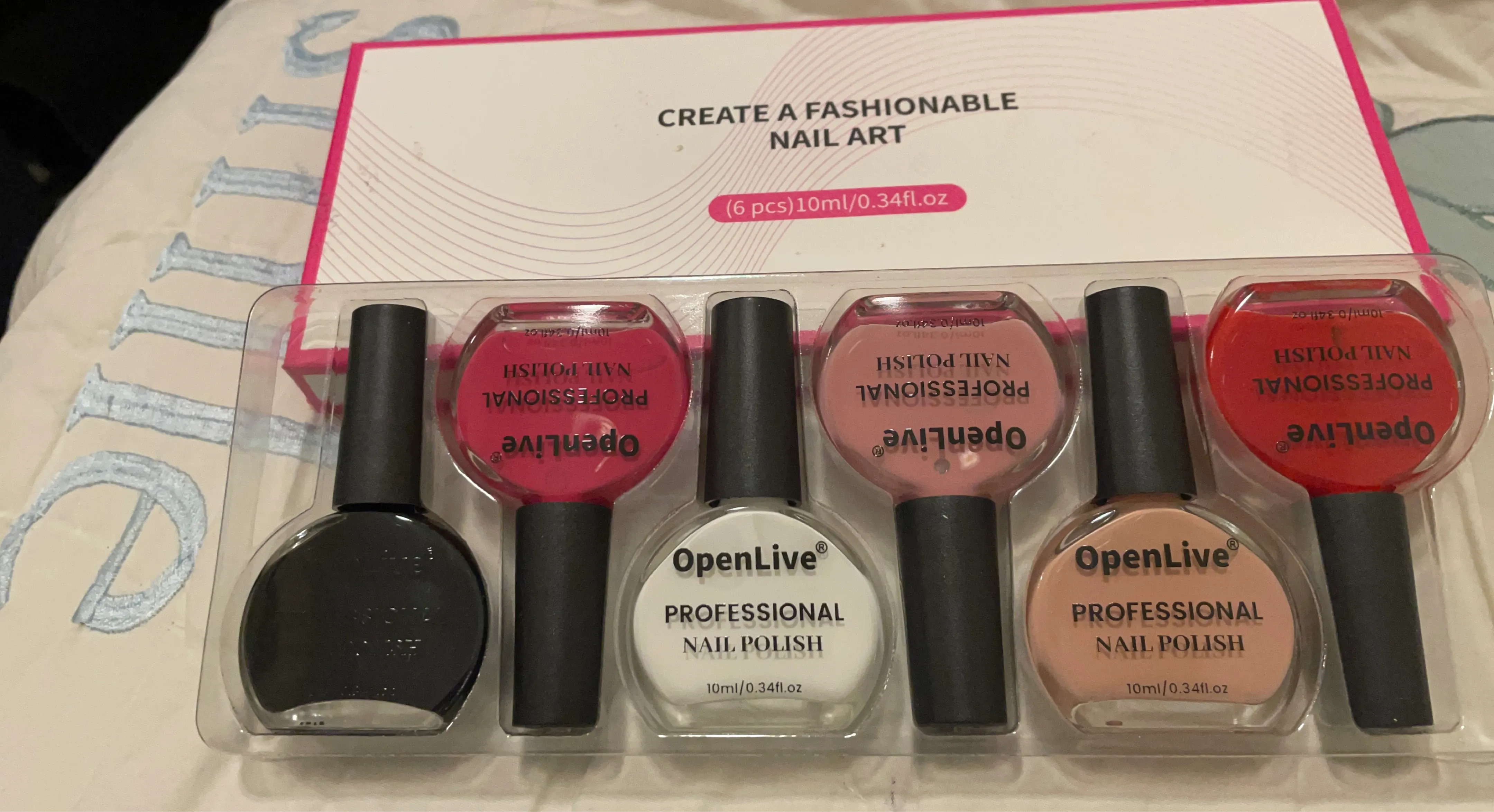 This is a set of 6 OpenLive professional nail polish bottles. Each bottle contains 10ml or 0.34 fl.oz of polish. The set includes a variety of colours for creating fashionable nail art.