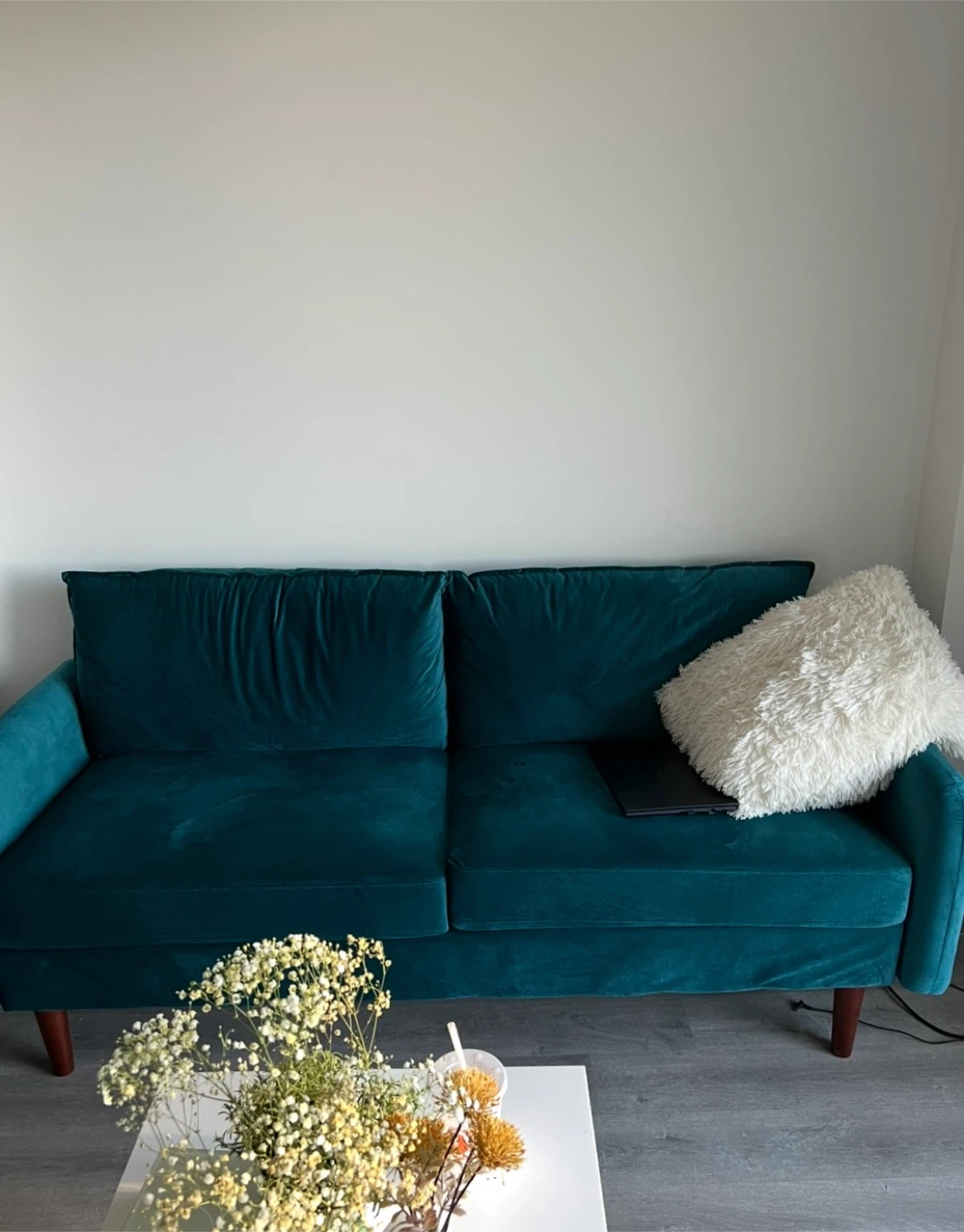 Teal velvet sofa. It's a two-seater couch with plush cushions. The material is soft velvet.
