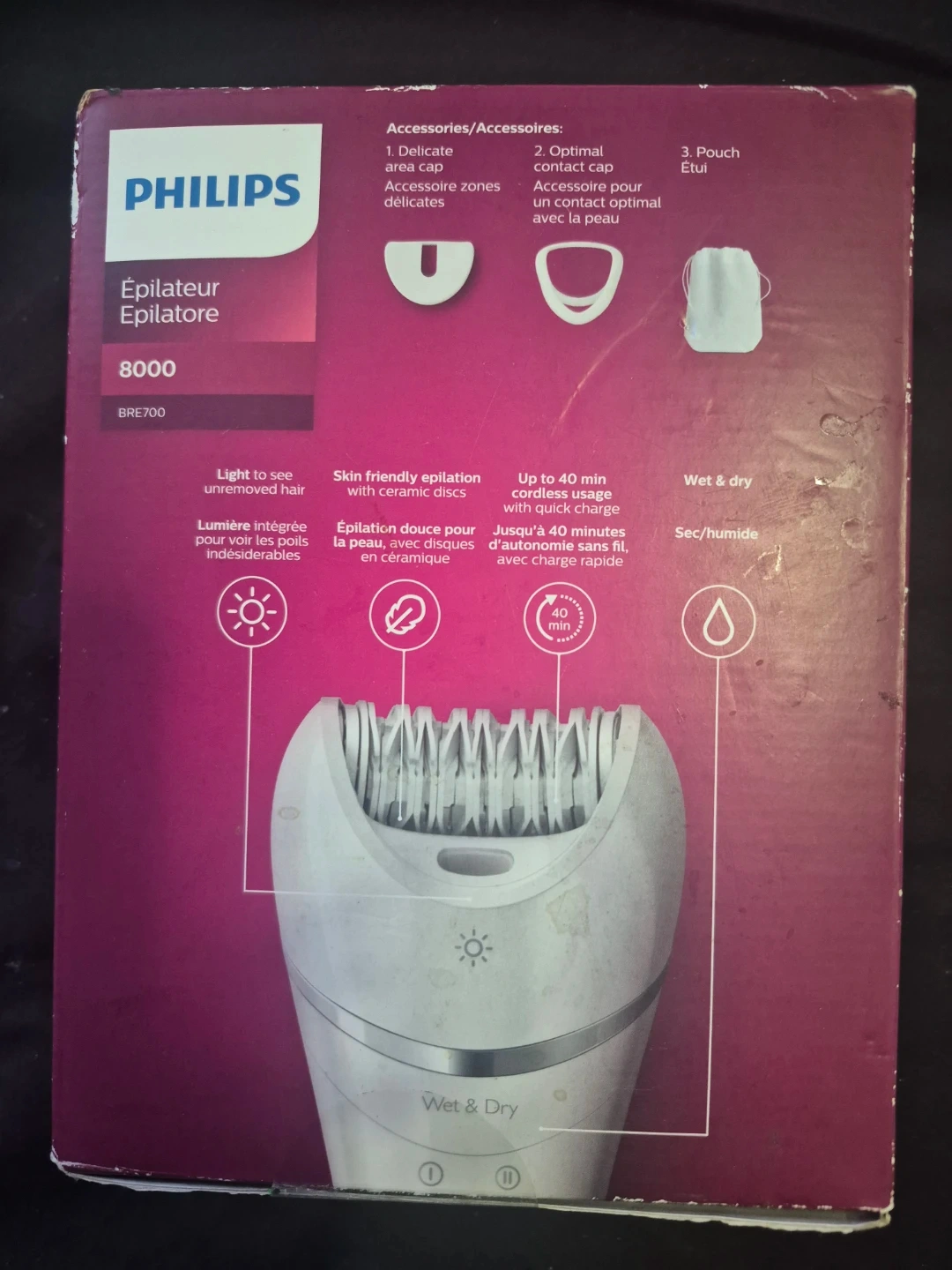 Philips Epilator 8000 model BRE700 for smooth skin up to 4 weeks. It's wet & dry and offers up to 40 minutes of cordless use with a quick charge. Includes several accessories for different areas. Provides gentle epilation with ceramic discs.