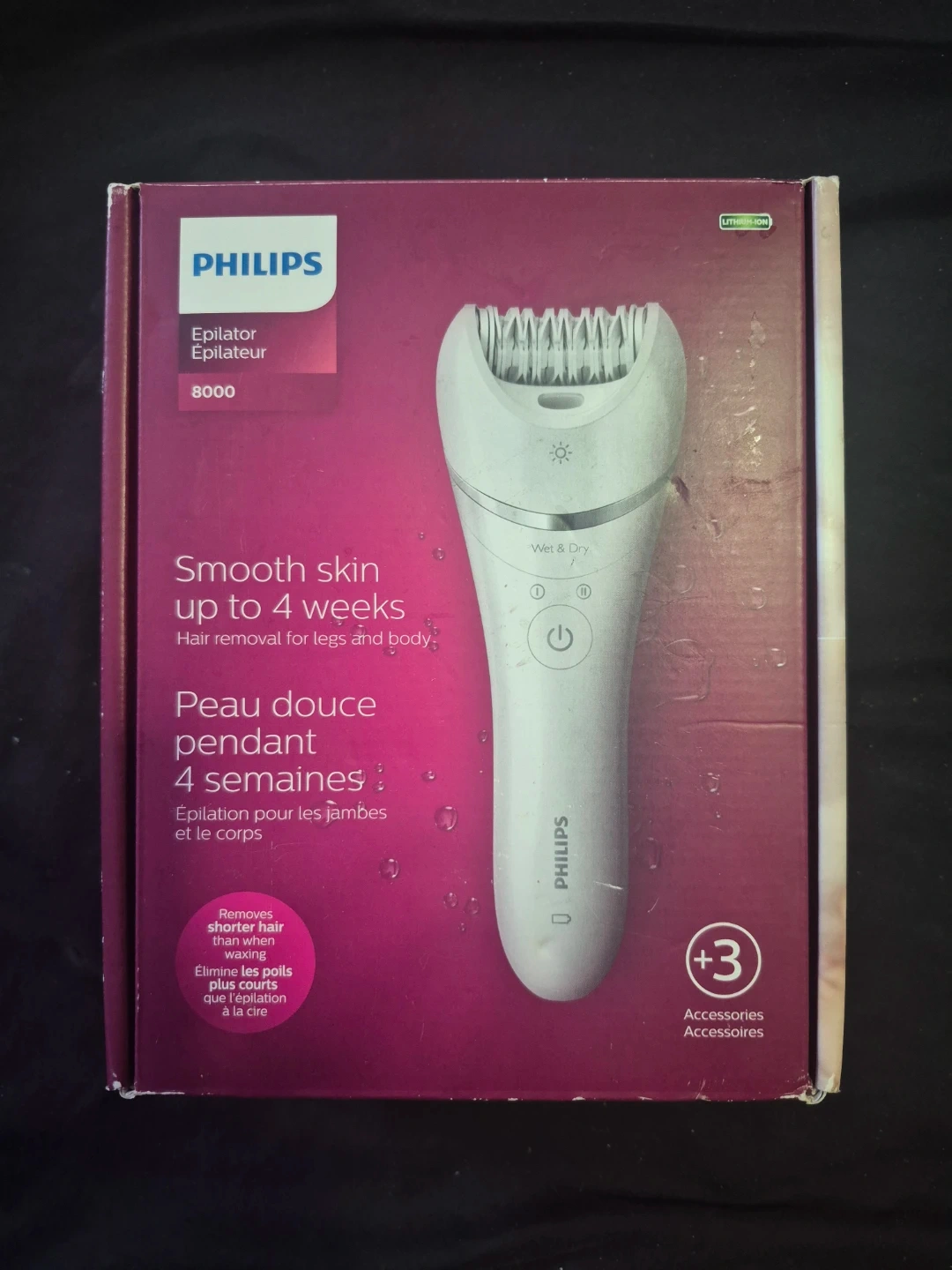 Philips Epilator 8000 model BRE700 for smooth skin up to 4 weeks. It's wet & dry and offers up to 40 minutes of cordless use with a quick charge. Includes several accessories for different areas. Provides gentle epilation with ceramic discs.