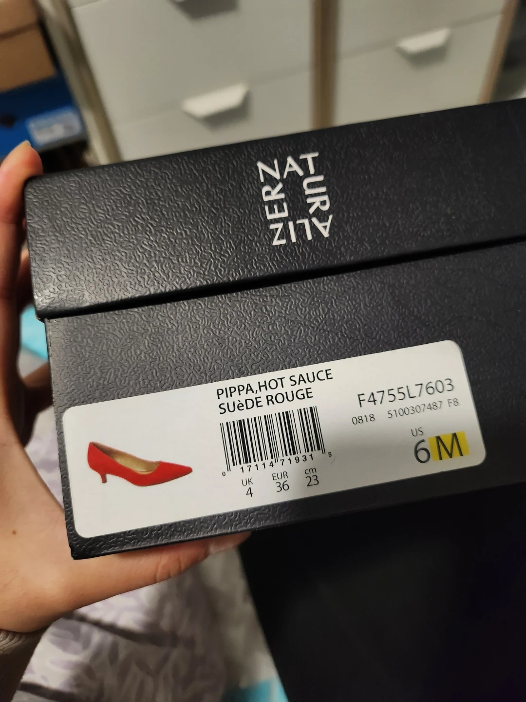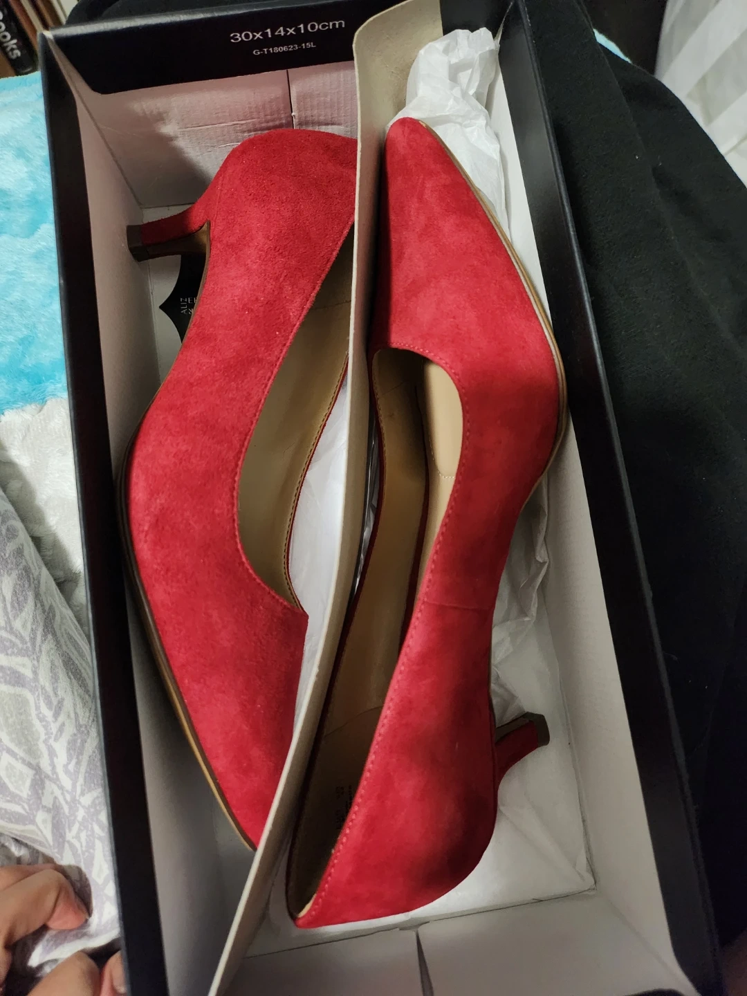 These are Naturalizer PIPPA heels in a vibrant Hot Sauce red. They're made of suede and come in a US women's size 6 medium. New