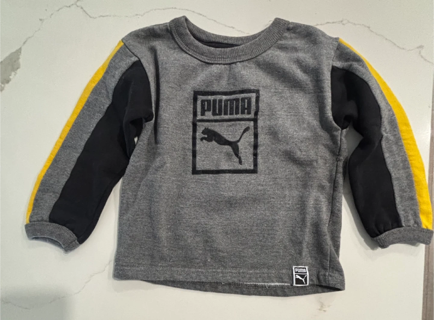 Excellent Used Condition. This is a grey Puma crew neck long sleeve t-shirt for kids. It's size US 2T. The shirt features a large Puma logo on the front and contrasting black and yellow stripes on the sleeves.