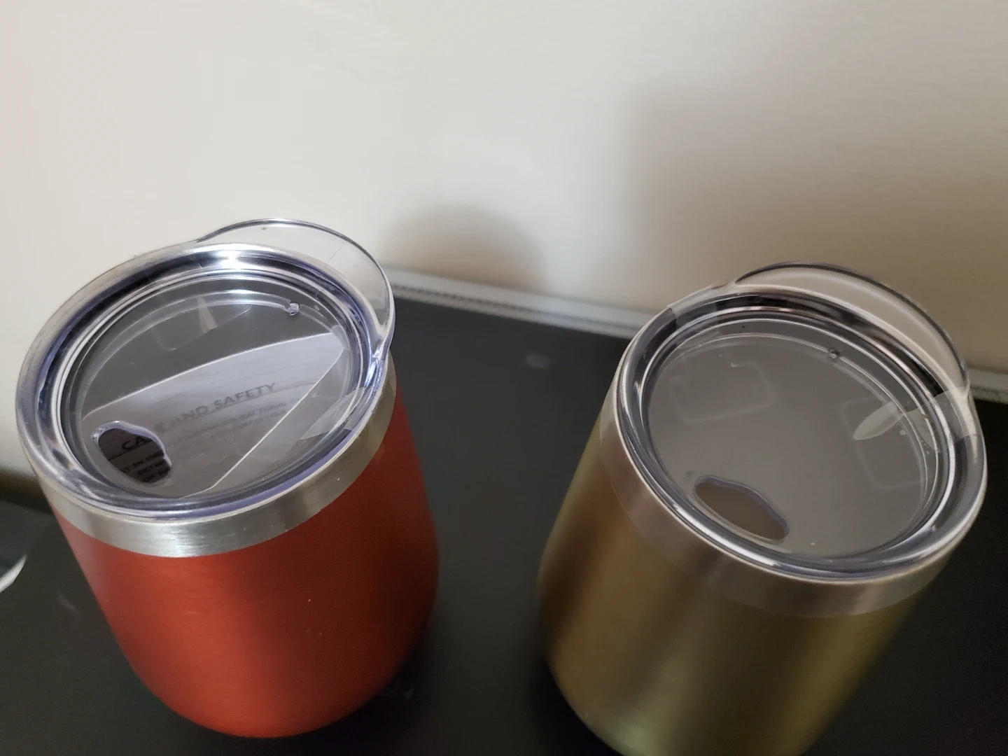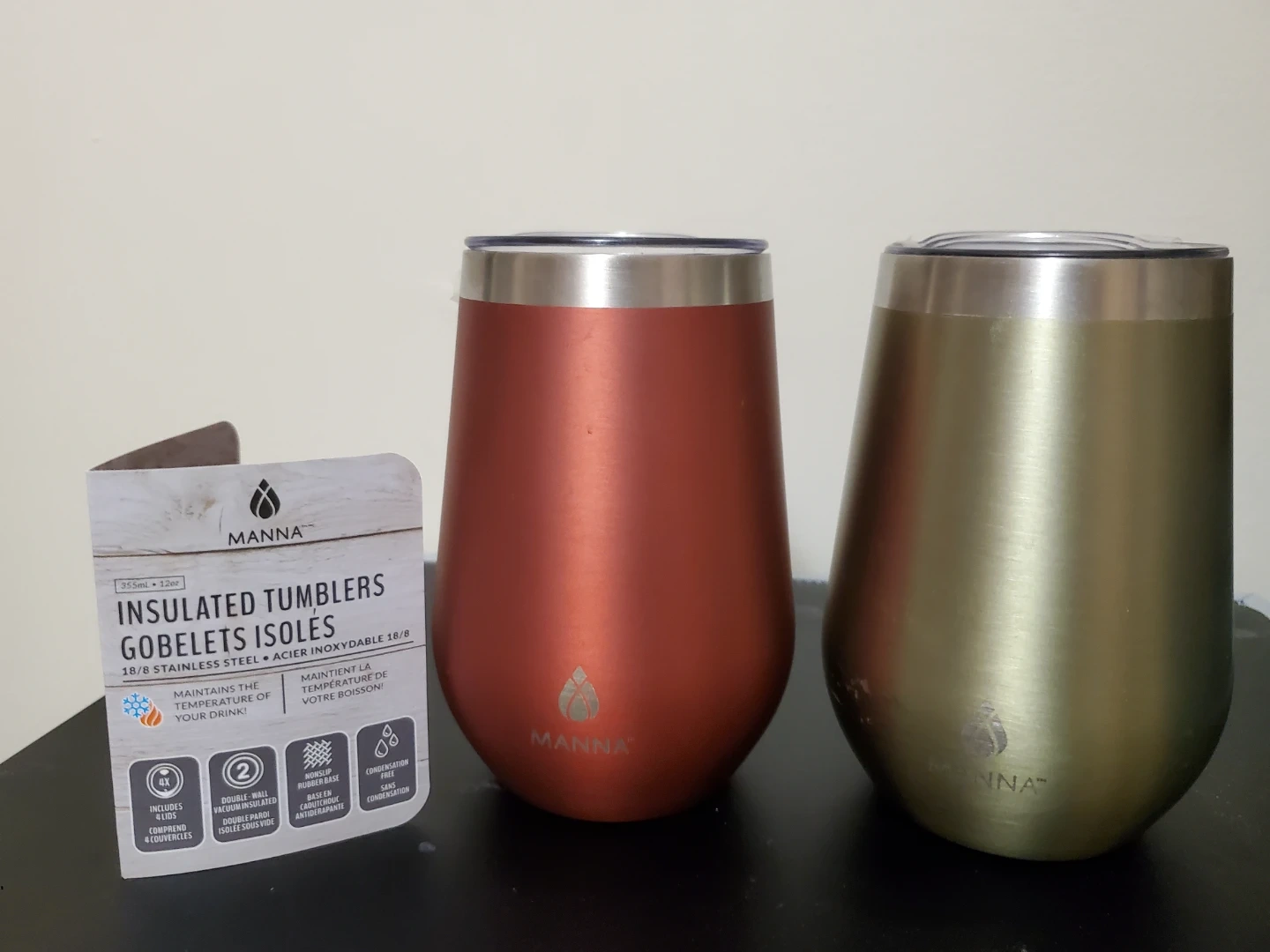 Set of two Manna insulated tumblers. Each tumbler is 12oz / 355ml and made from 18/8 stainless steel. They're designed to maintain the temperature of your drink. Includes lids.