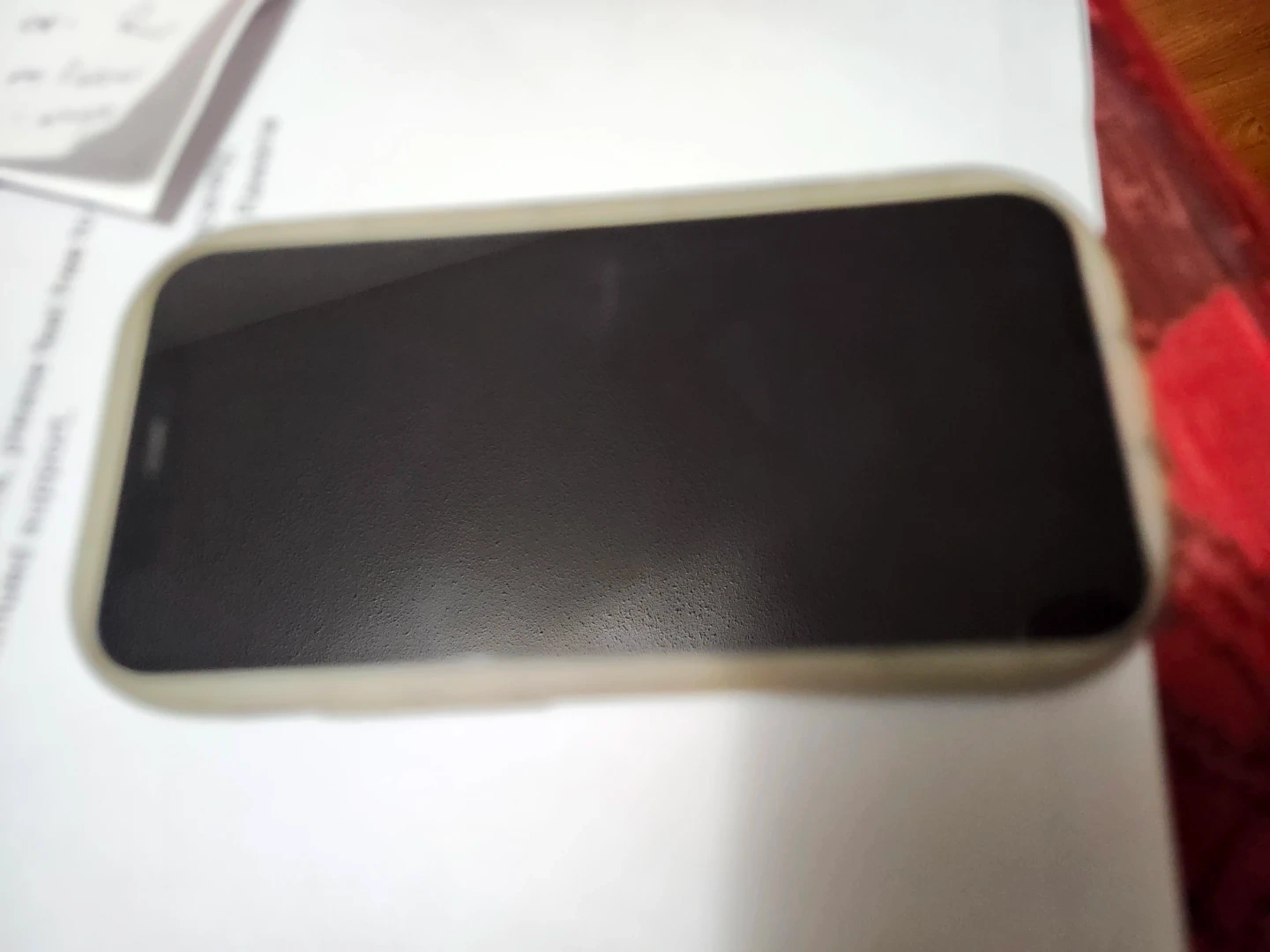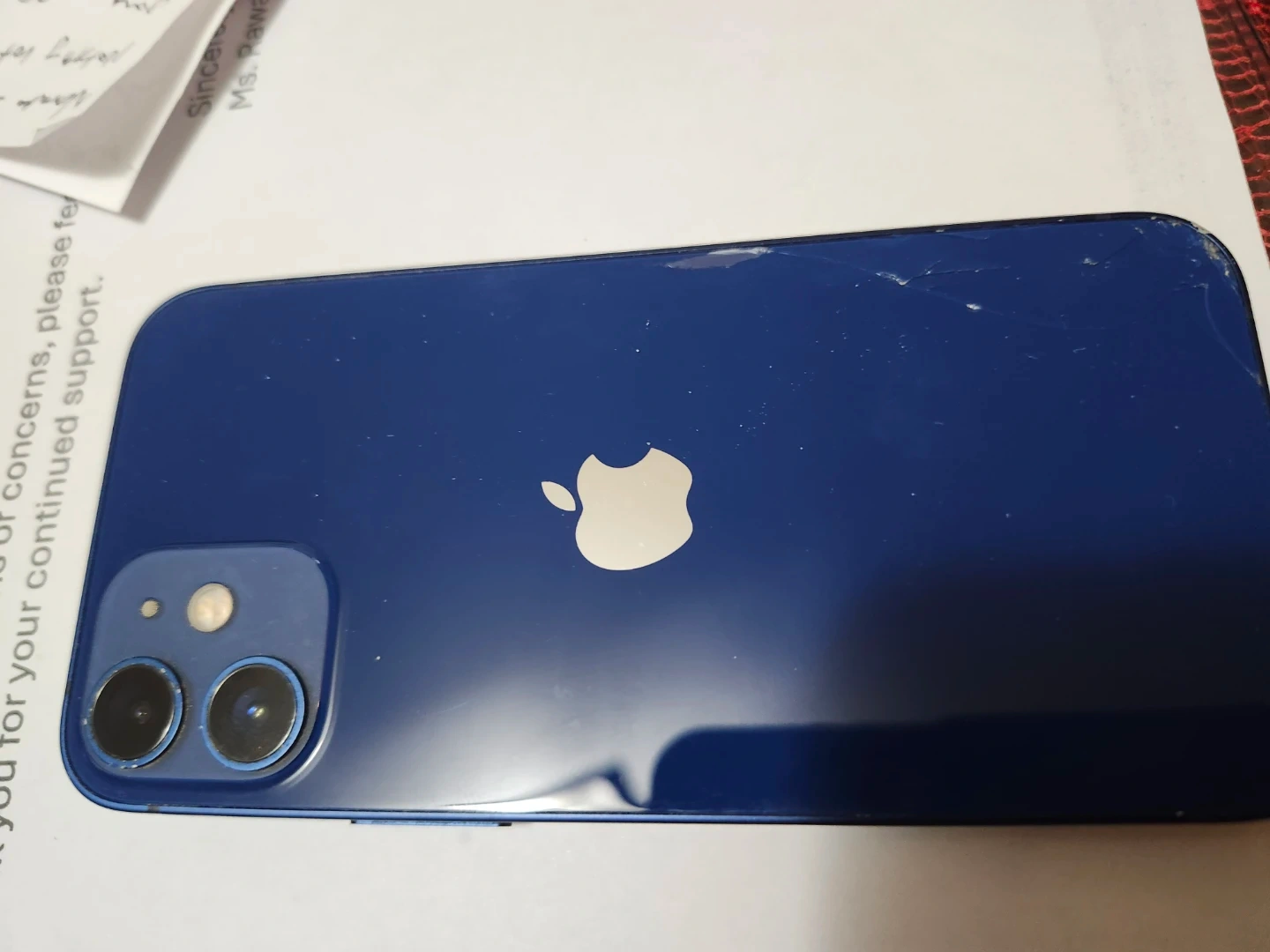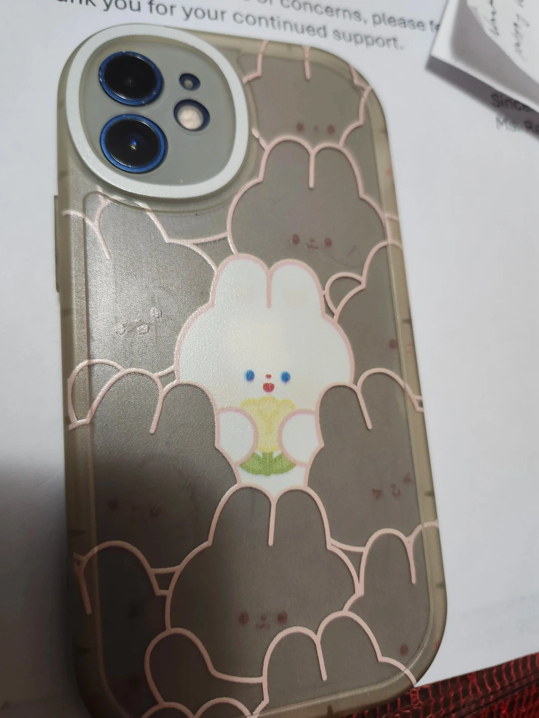 This is an Apple iPhone 12 in blue. It's a smartphone with a dual-camera system. The phone comes with a protective case featuring a cute cloud and bunny design.