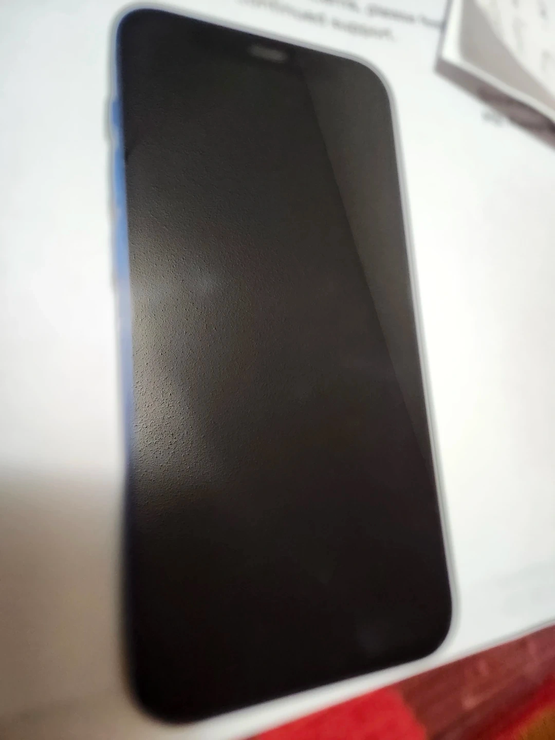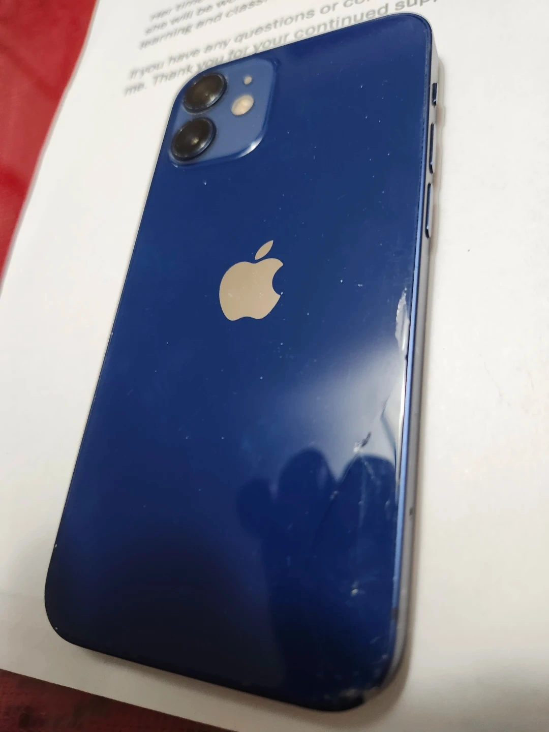 This is an Apple iPhone 12 in blue. It's a smartphone with a dual-camera system. The phone comes with a protective case featuring a cute cloud and bunny design.